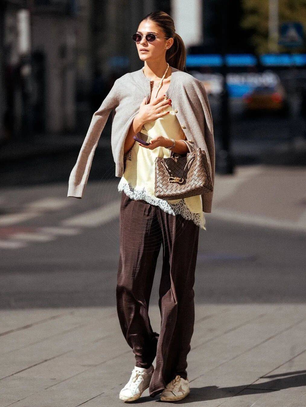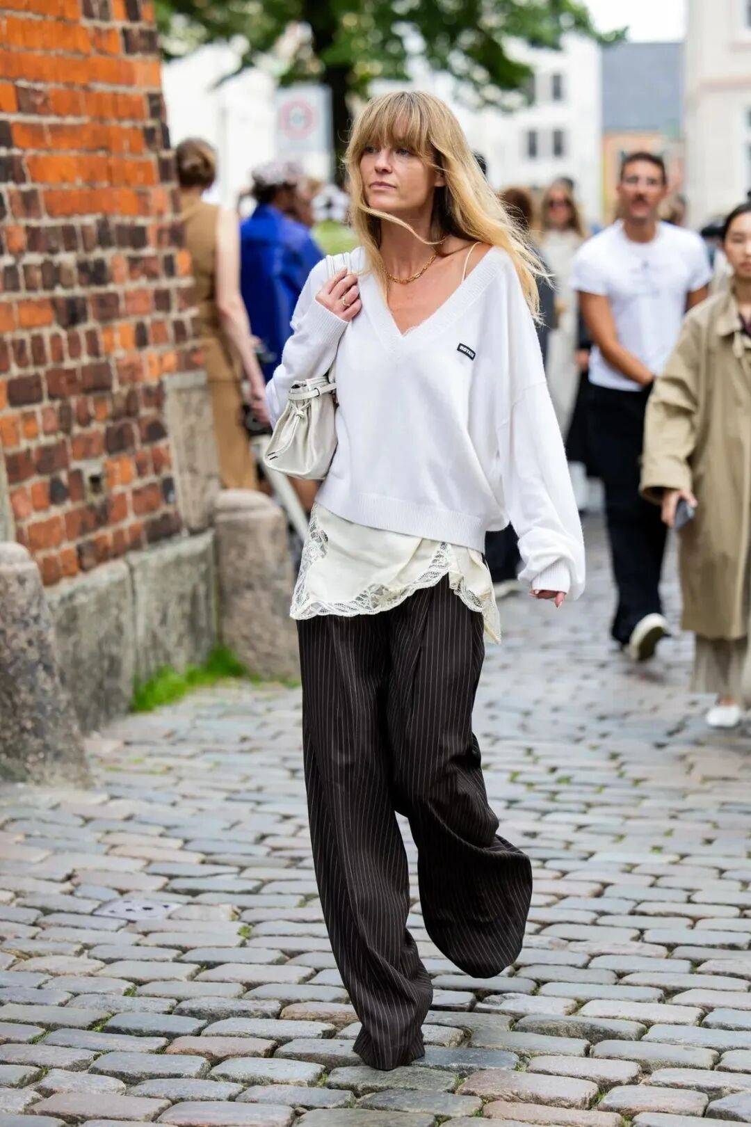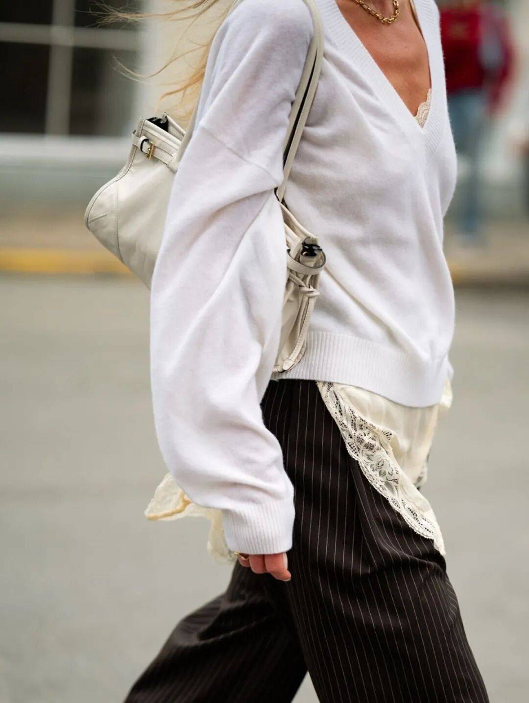 一件线条利落的V领针织开衫或套头衫,自带一种洒脱的性感,而当它与一件蕾丝背心叠穿时,这种性感便有了更丰富的层次。