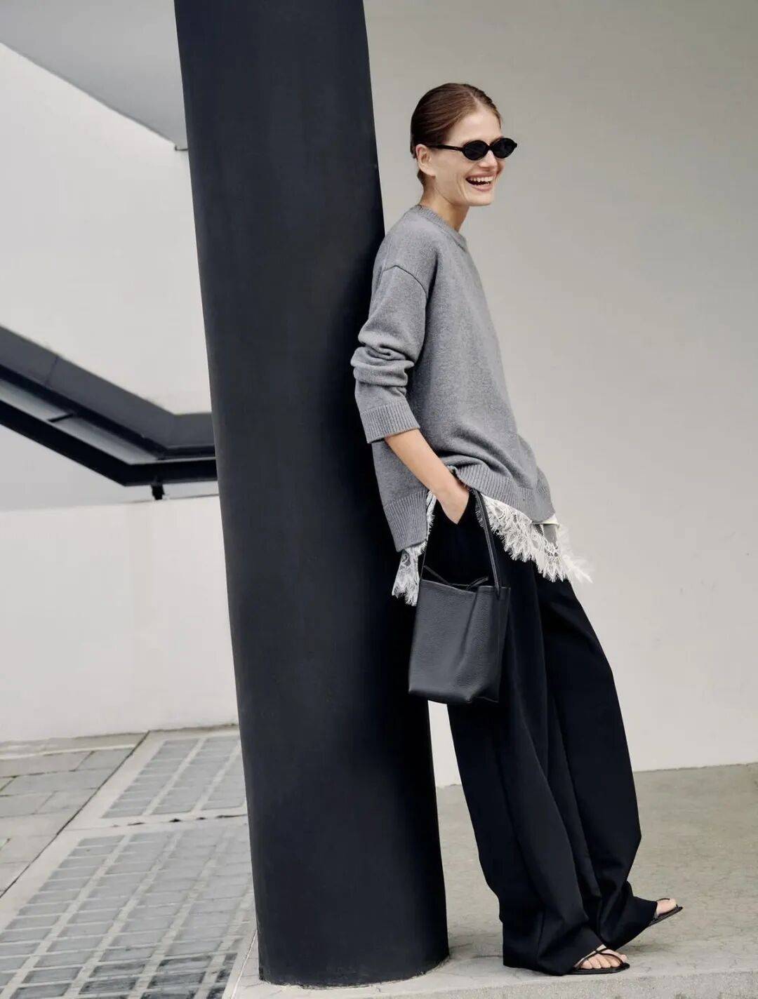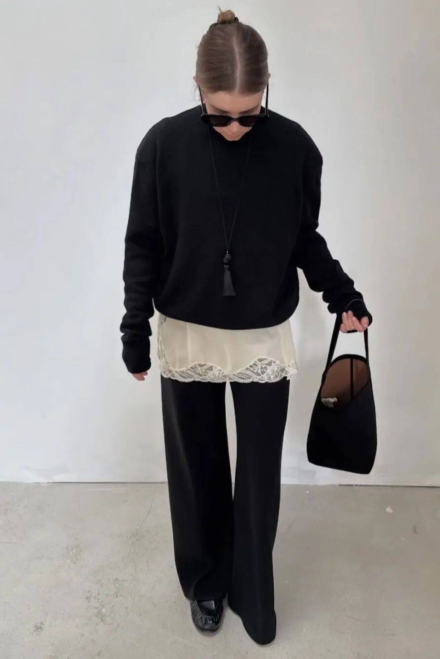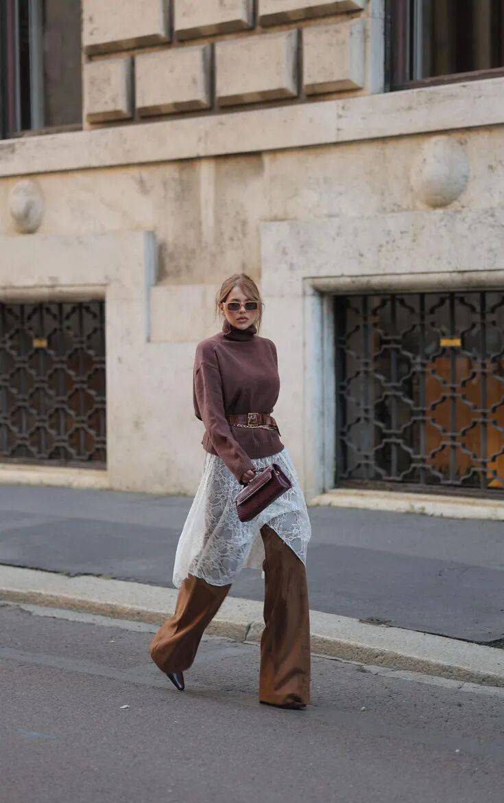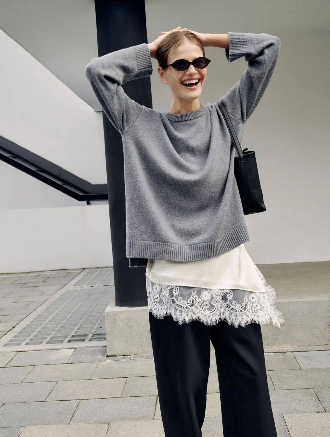 想要穿出高级感,不妨试试同色系法则,让蕾丝与针织在同一个色系里,质感便在不言中展露。