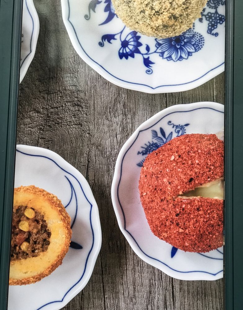 爱尝鲜的我们,还慕名去了一家捷克“饺子”店。它家有二十多种现场制作的“饺子”,用土豆面团包着各种馅料,也许叫“土豆团子”更贴切?我们点了树莓白巧克力、榛子和一款咸味的。好吃是好吃,但说实话,心里还是更喜欢上海的青团、宁波的黑洋沙汤圆,还有咱东北的饺子。哈哈!