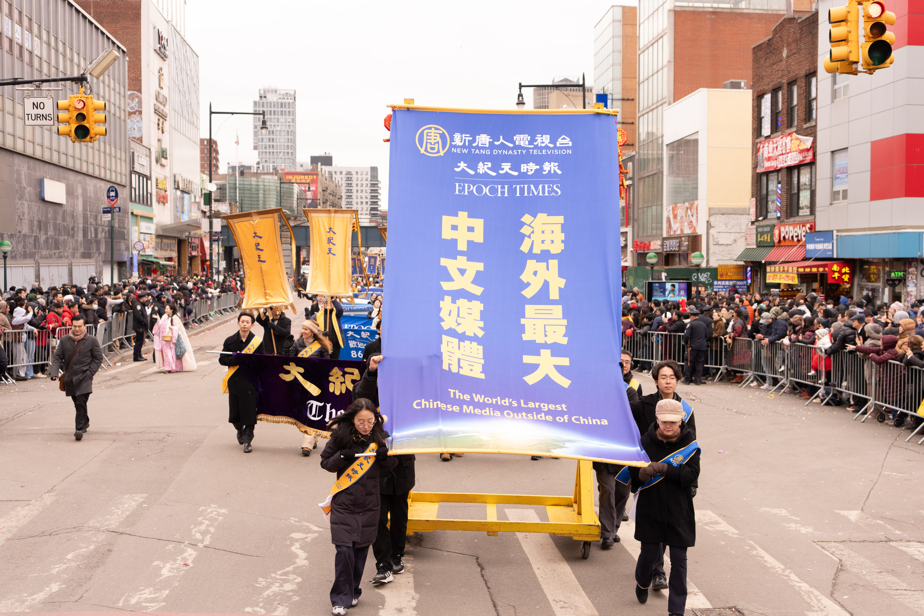 在2月21日的游行中,大纪元新唐人媒体集团准备了一辆花车和数十条横幅,展示了深受观众喜爱的如:《细雨人生》《今日点击》《全球新闻》《中国禁闻》《健康1+1》《我们告诉未来》《传奇时代》和《今日大纽约》等栏目名称;今年新唐人方阵还制作了九个国际文化比赛的横幅。