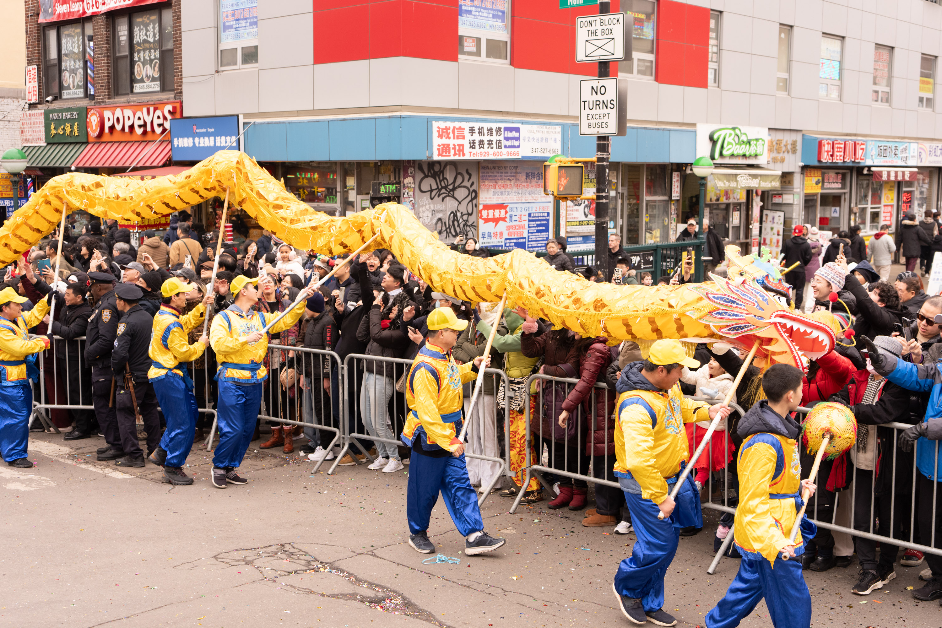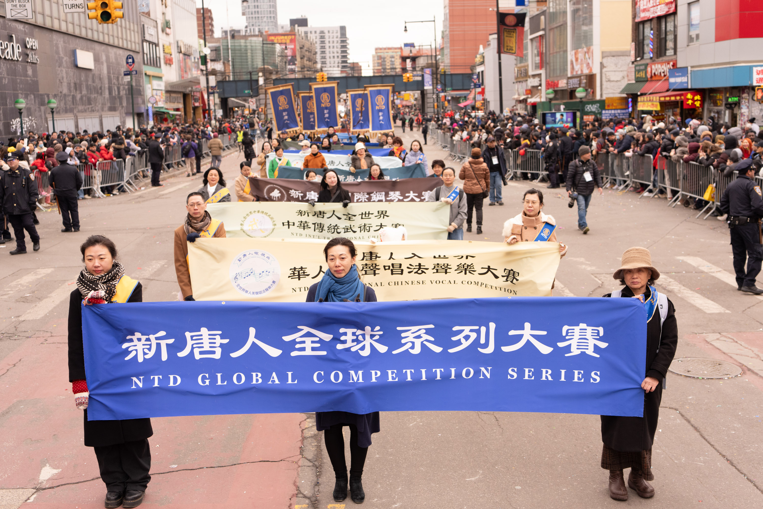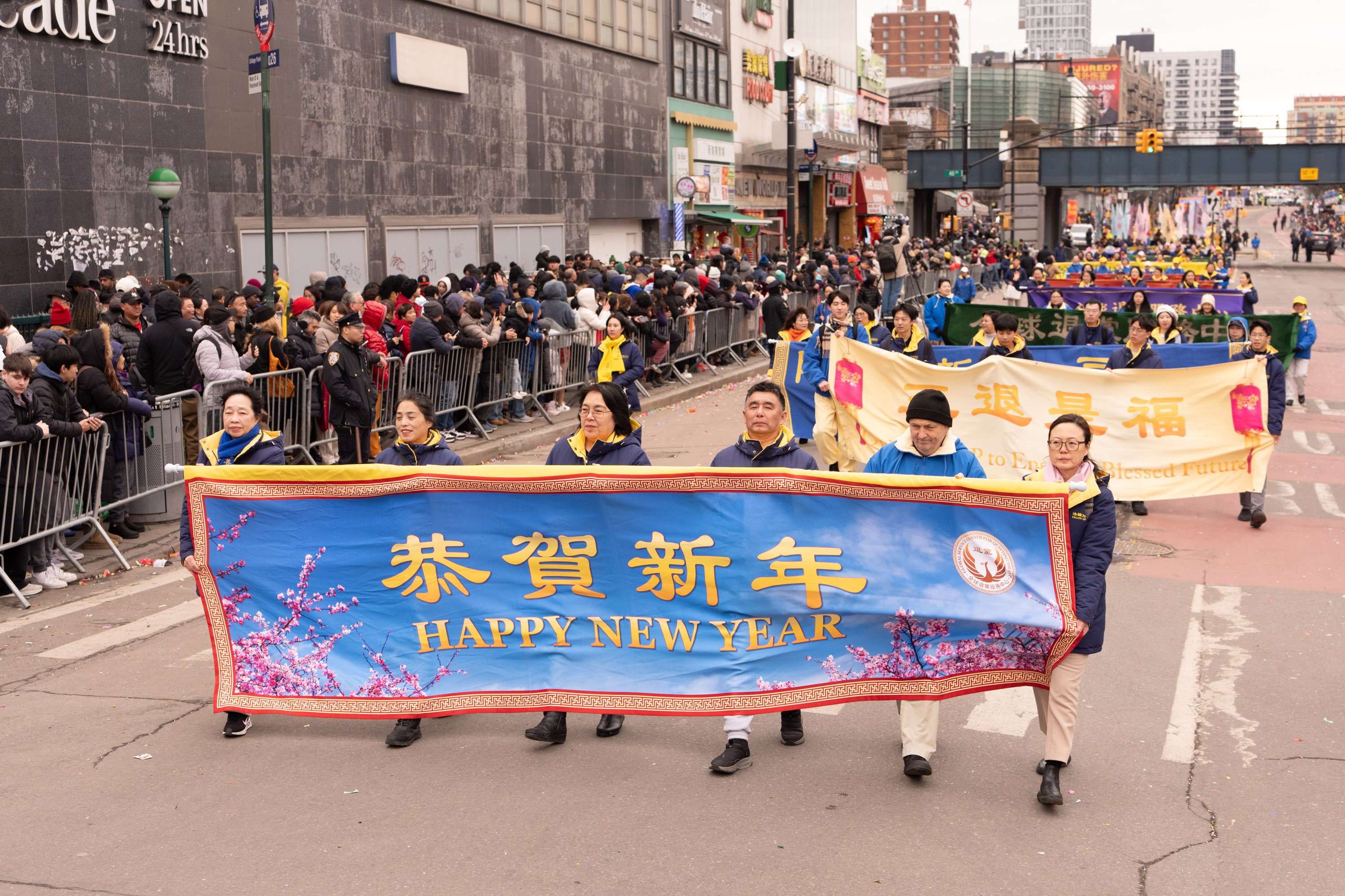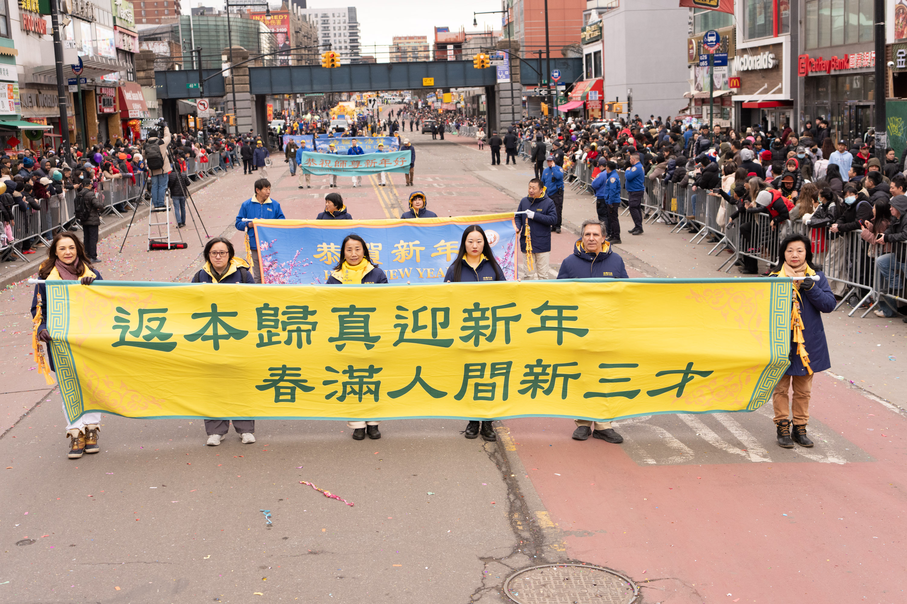 2月21日丙午马年大年初五,法轮功学员参加了纽约市最大华人聚居地——法拉盛一年一度的中国新年大游行活动。(戴兵/大纪元)大纪元新唐人媒体集团恭贺新年