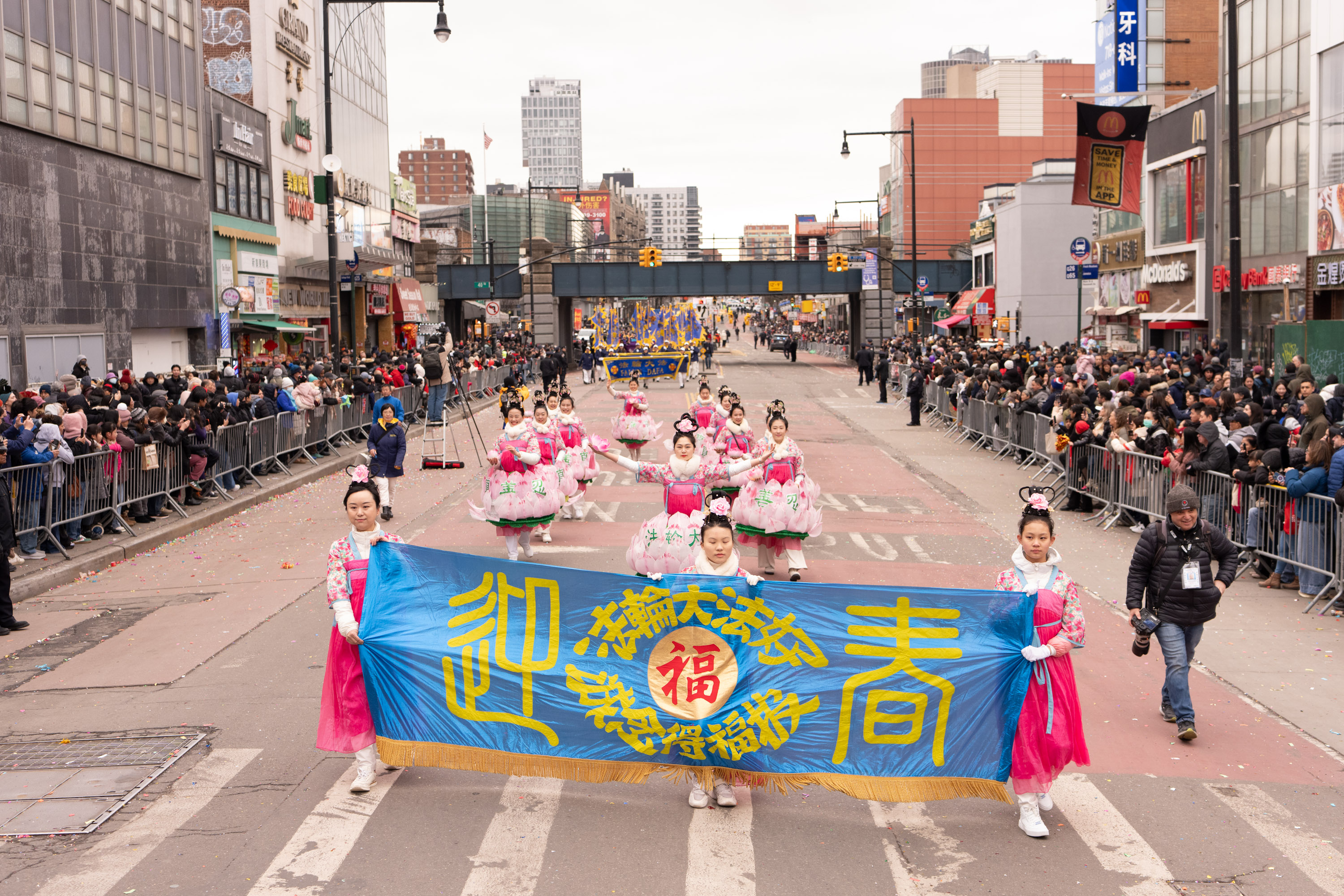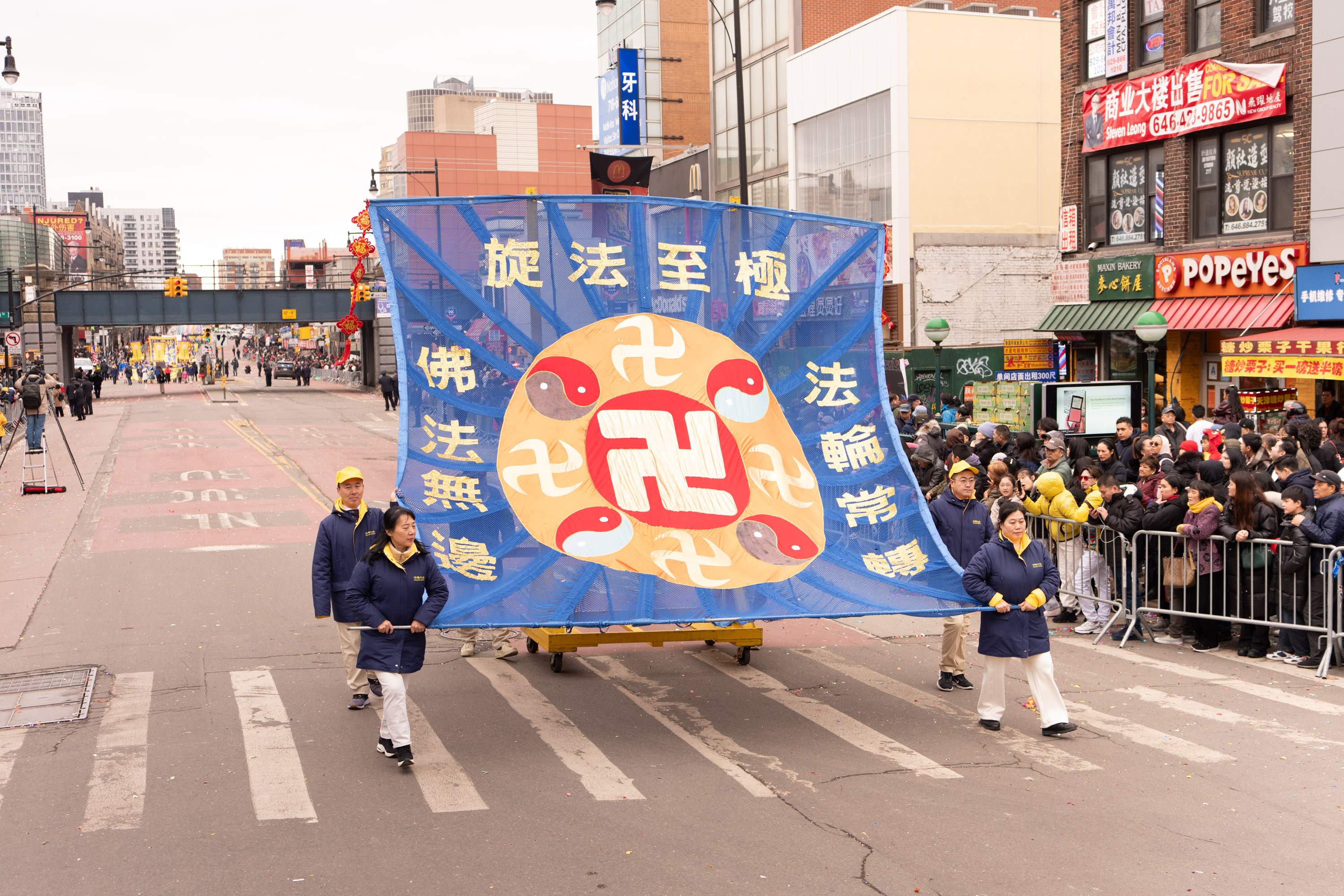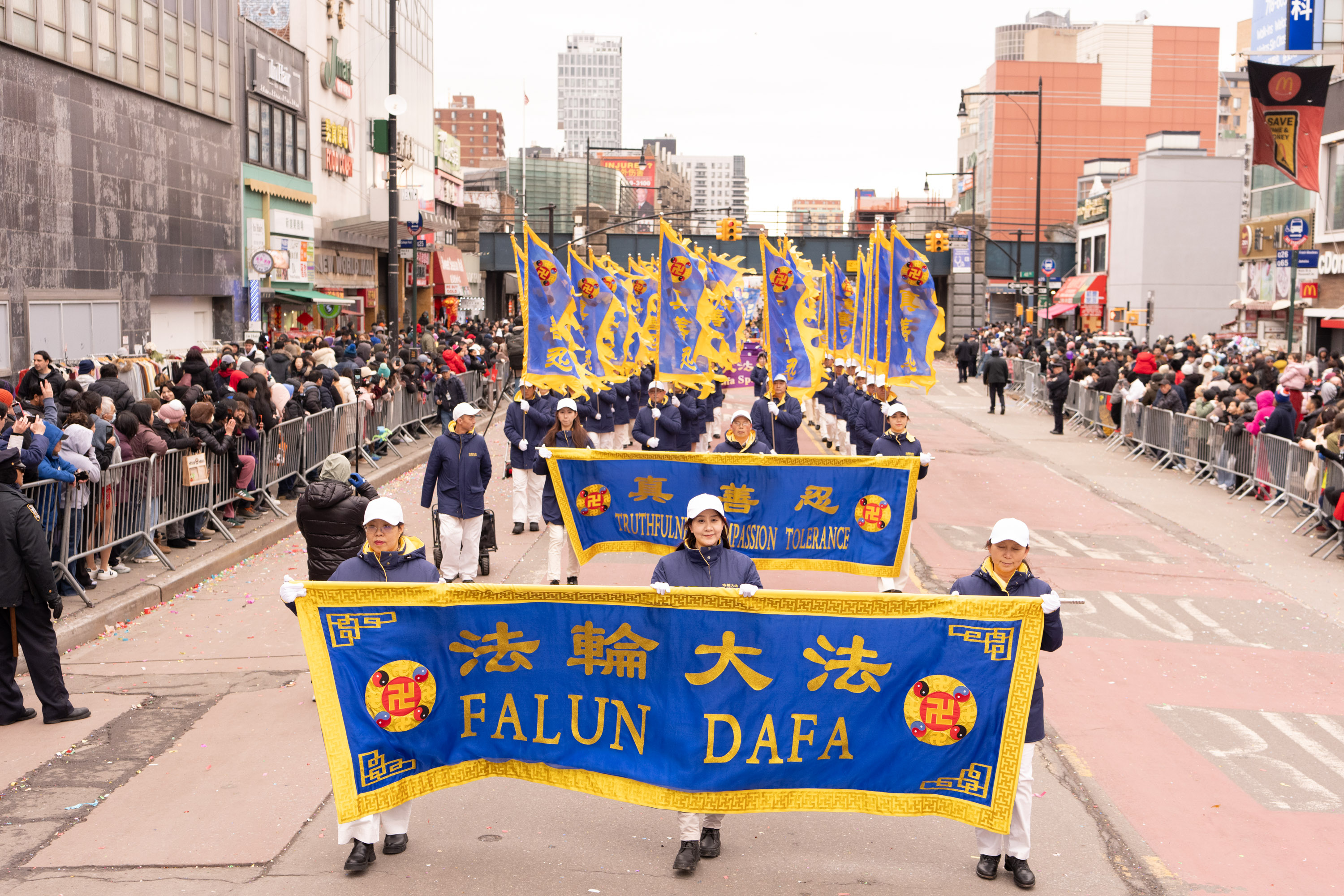 法轮功学员也参加了纽约市这个最大华人聚居地——法拉盛一年一度的中国新年大游行活动。第一方阵天国乐团的队员,气势如虹、威风凛凛,奏响《法轮大法好》《神圣的歌》《法鼓法号震十方》《法轮圣王》等乐曲。