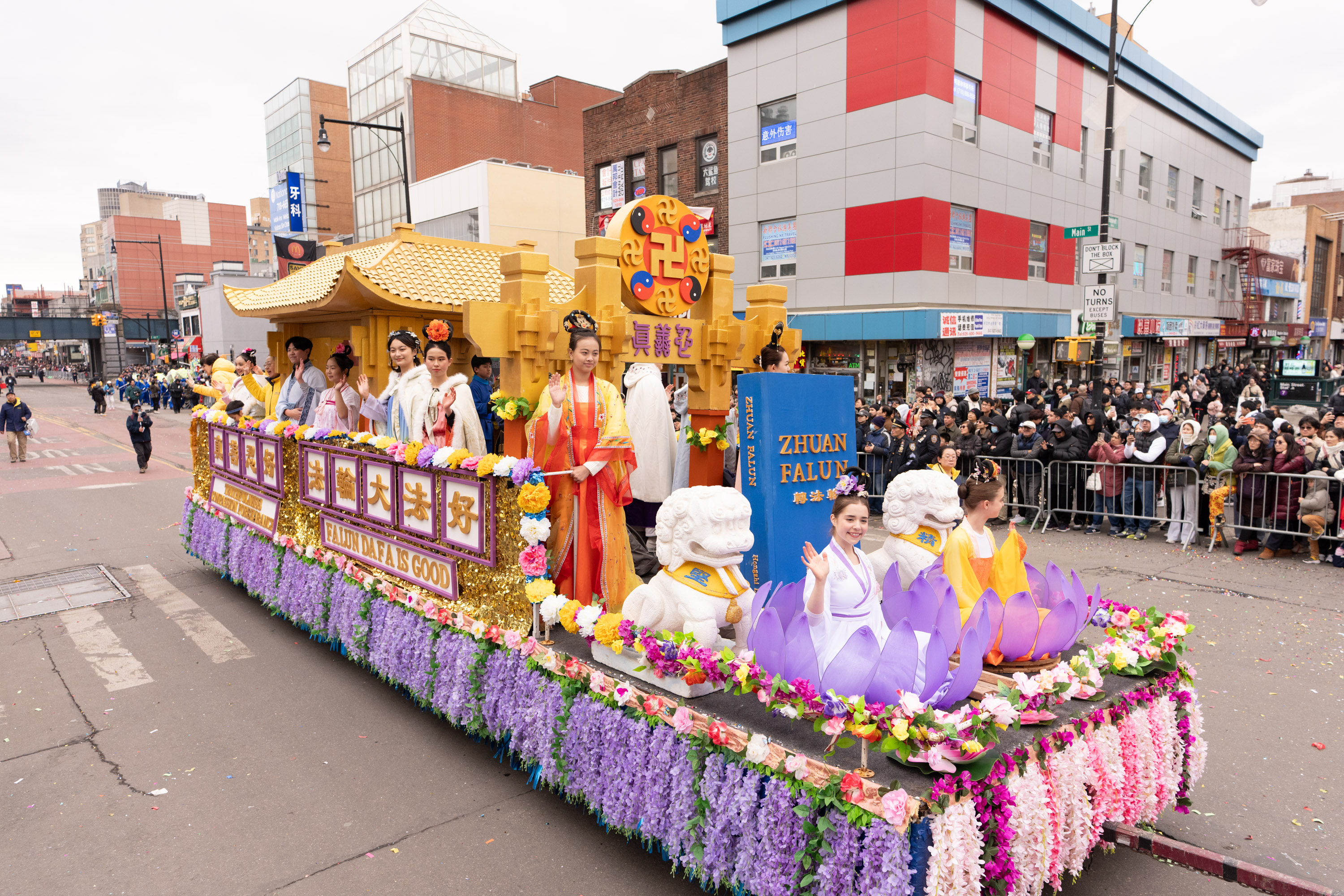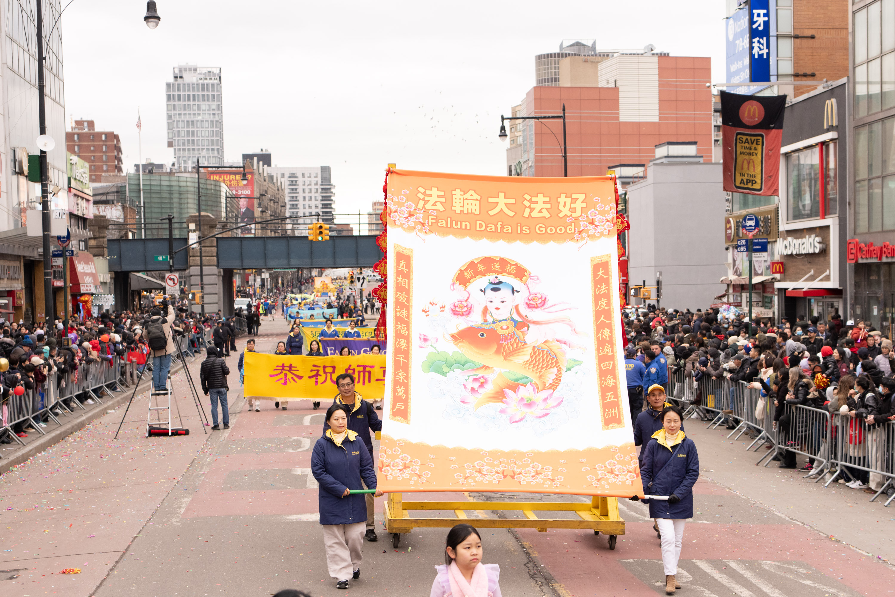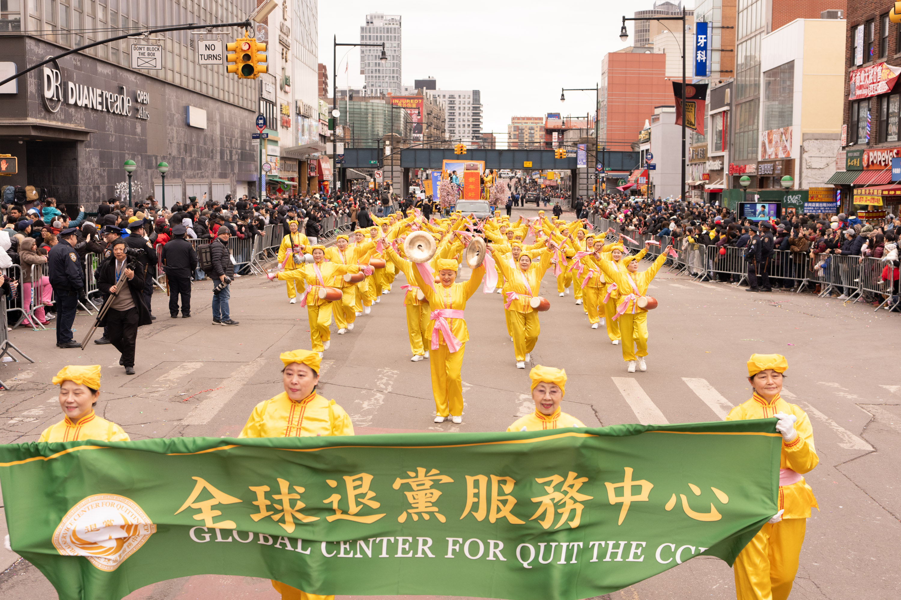 法轮功学员也参加了纽约市这个最大华人聚居地——法拉盛一年一度的中国新年大游行活动。第一方阵天国乐团的队员,气势如虹、威风凛凛,奏响《法轮大法好》《神圣的歌》《法鼓法号震十方》《法轮圣王》等乐曲。