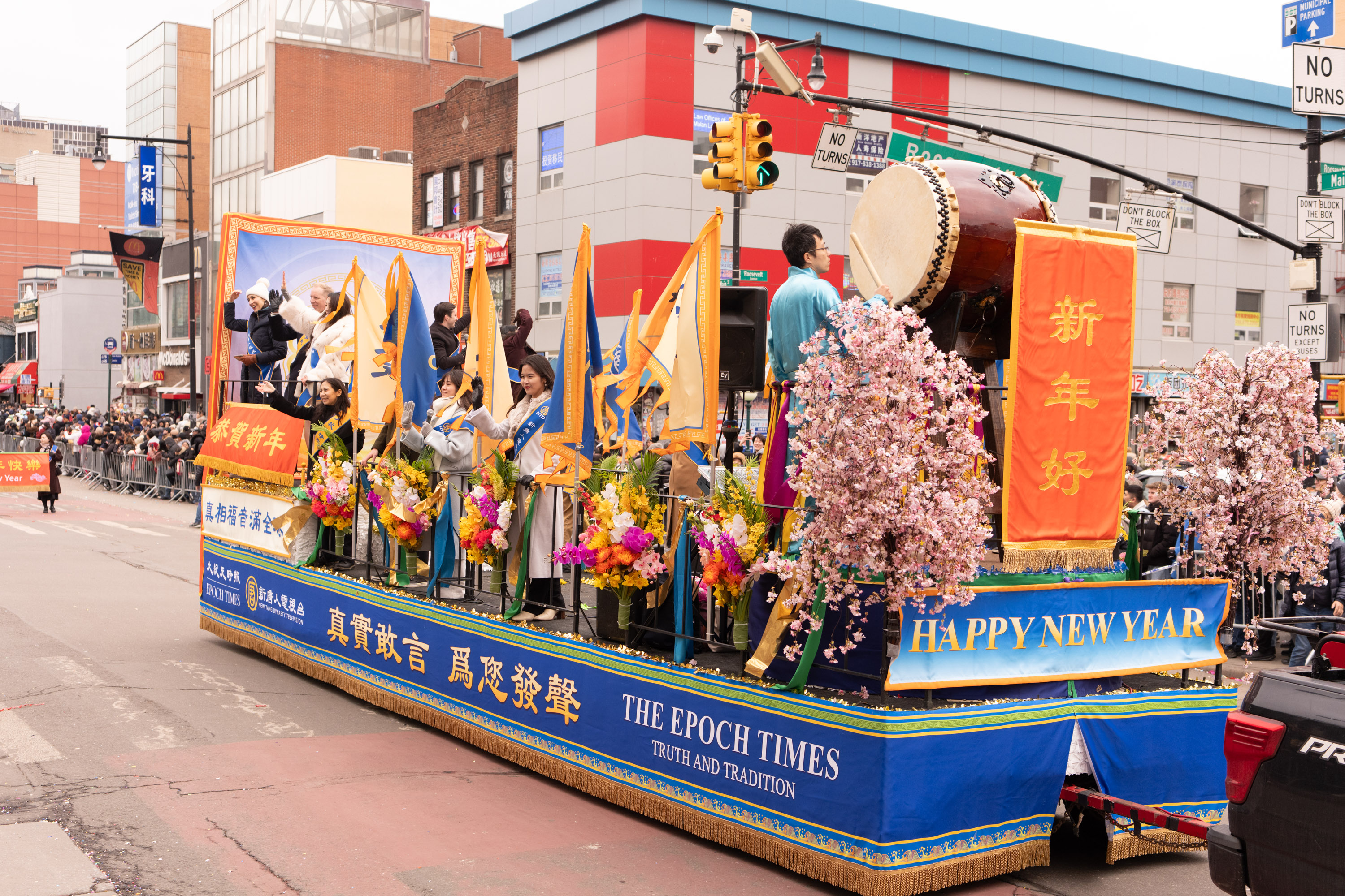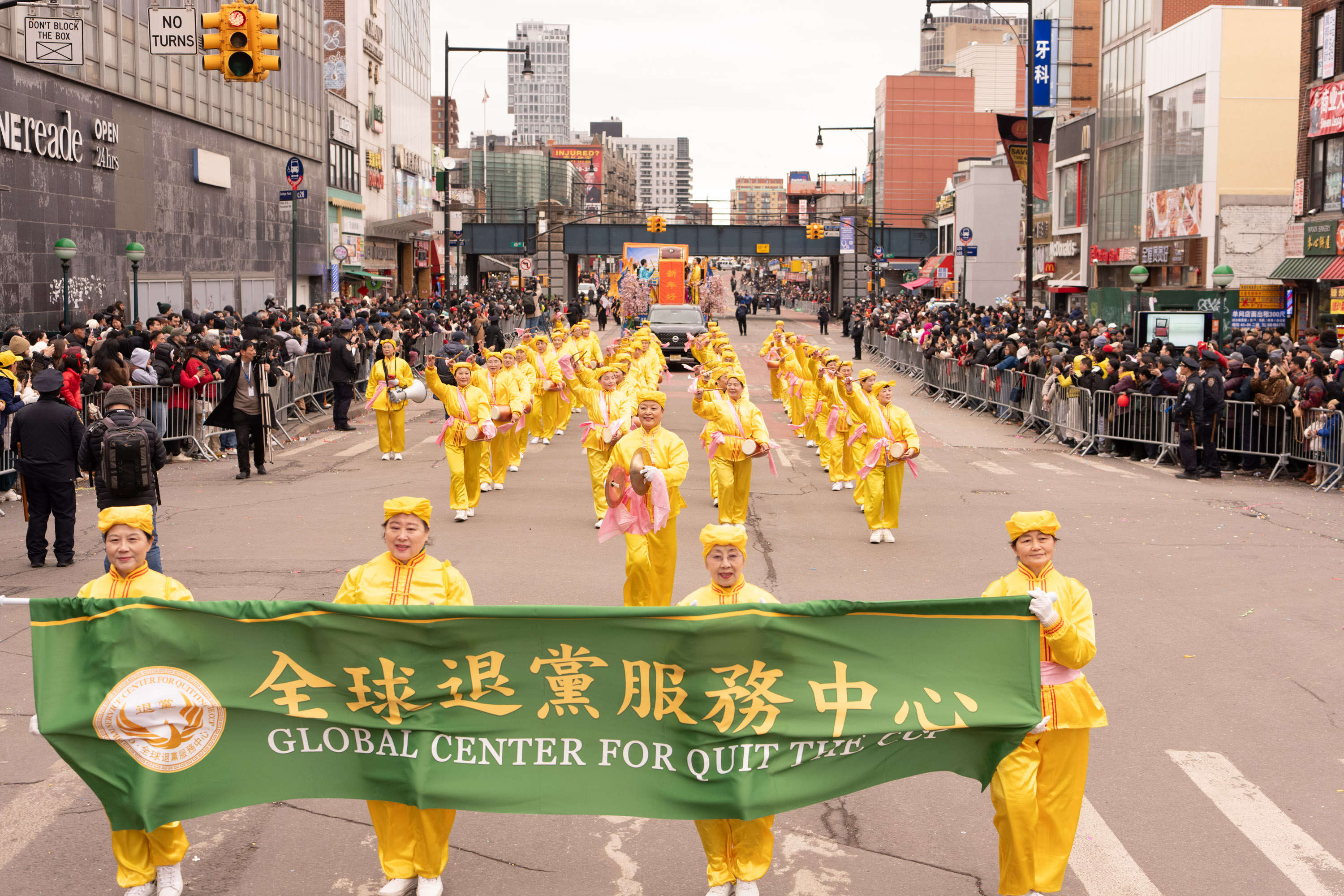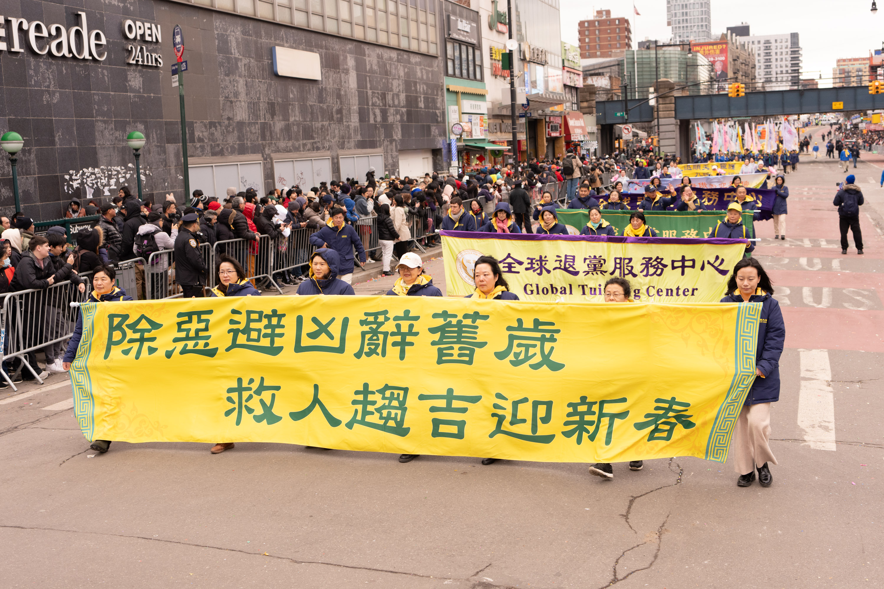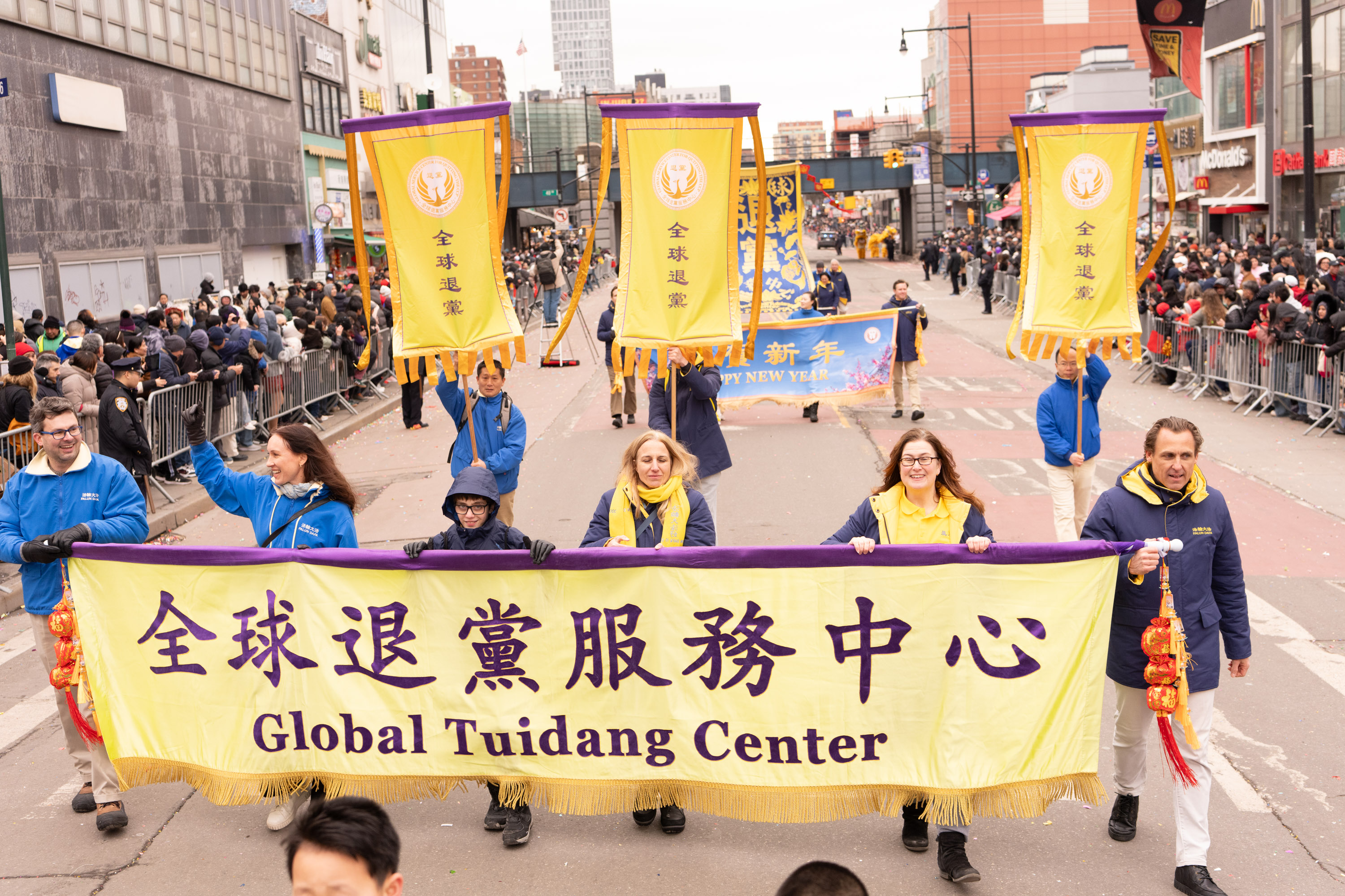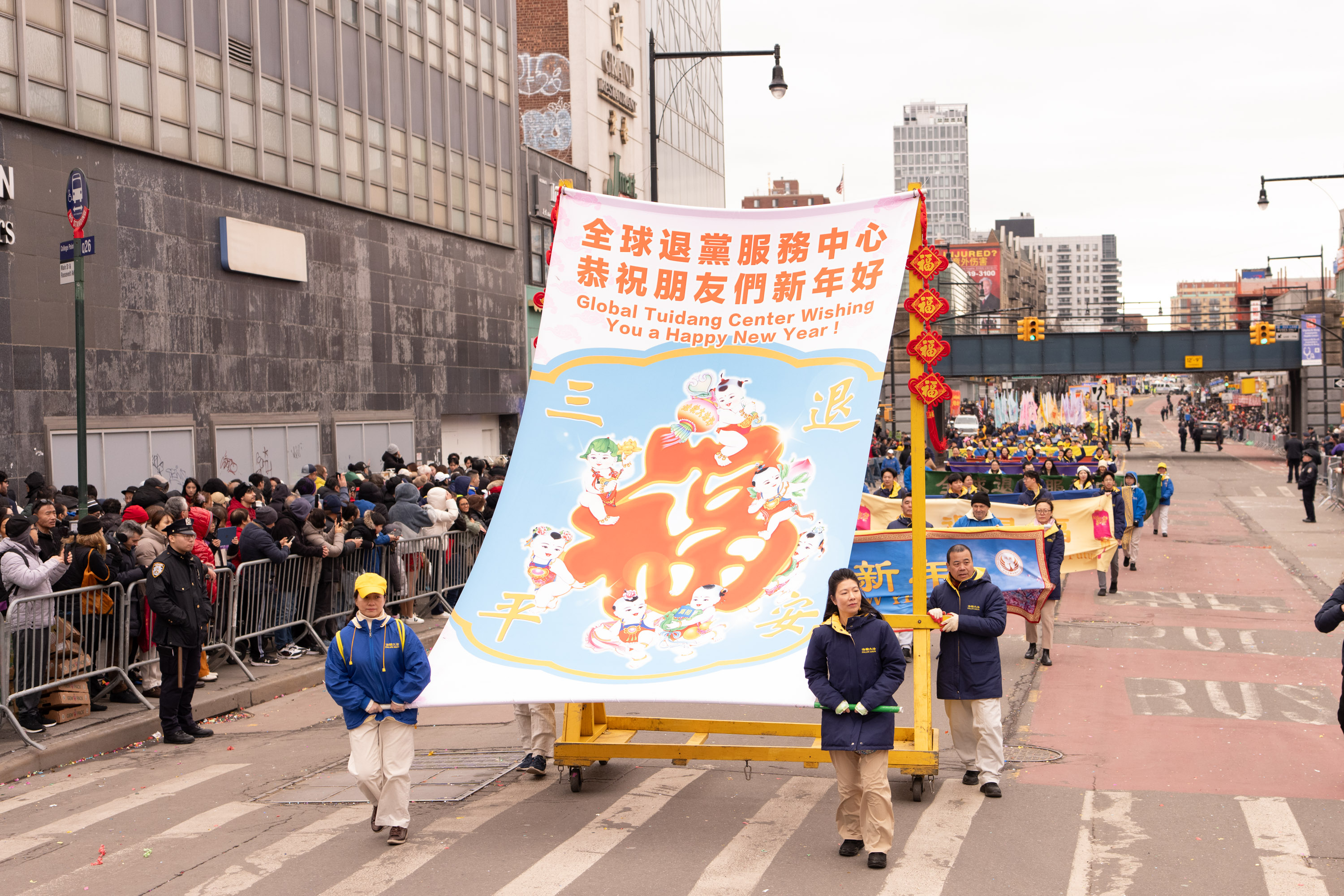 2月21日丙午马年大年初五,大纪元时报、新唐人电视台参加了纽约市最大华人聚居地——法拉盛一年一度的中国新年大游行活动。(戴兵/大纪元)全球退党服务中心祝朋友们新年好