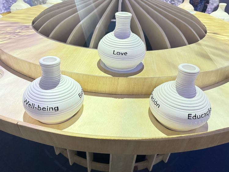 博物馆通过各种互动展览、数字影像和艺术装置等展示主题。这些写着英文单词的陶罐,让我们驻足。如果只能选三个陶罐,那我就选:“爱”、“健康“和”教育“。