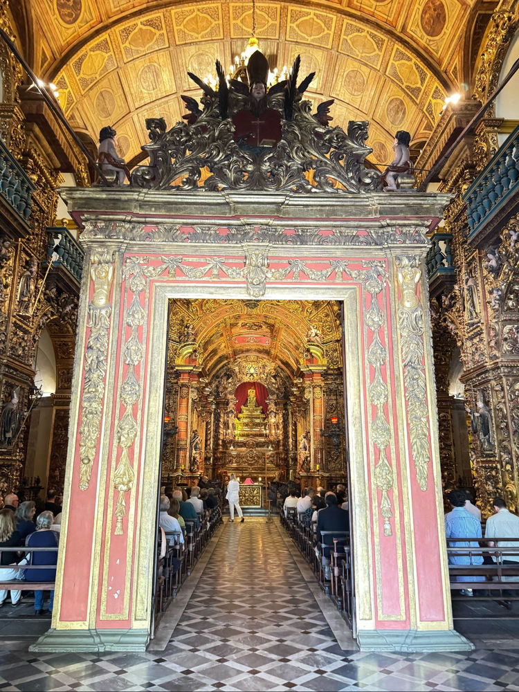 与立面朴素风格不同,教堂的内饰非常丰富,从17世纪末的巴洛克风格到18世纪下半叶的洛可可风格,精雕细刻,金光闪闪。里边正在做礼拜,我们只在门口张望。