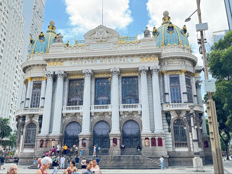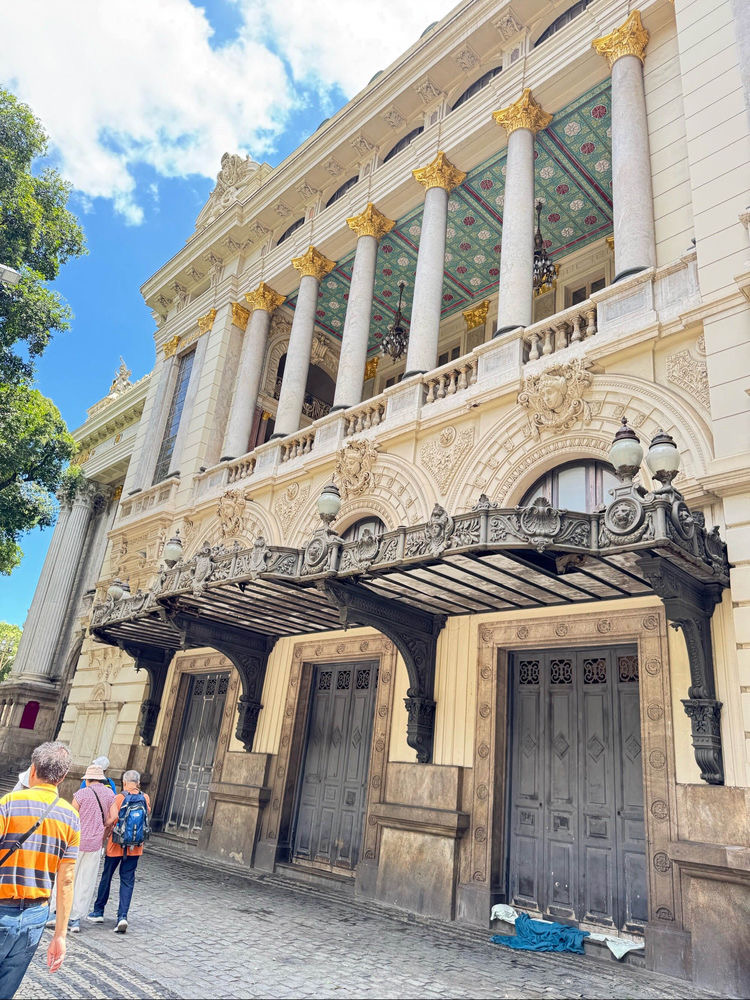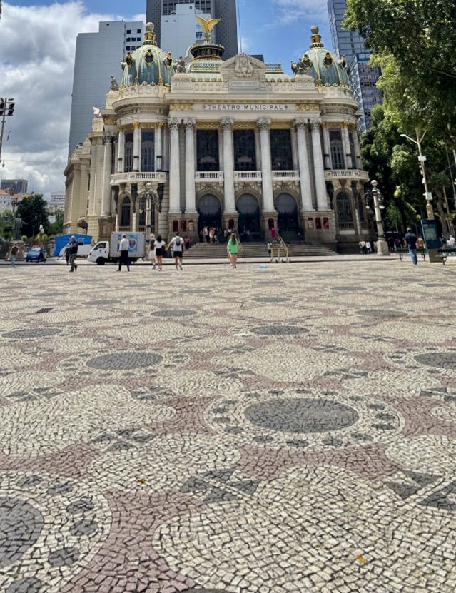 走到这建筑的正面一看,原来是里约市立歌剧院!这座华美的法国风格剧院,坐落在西尼兰地亚广场的一端。整个广场由碎石地砖铺成,花纹是我看到过的,最复杂而雅致的。(下图)