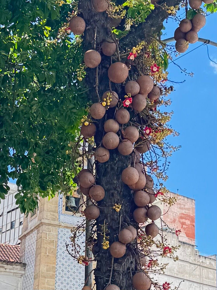 街边“巨大的桂圆”和红色小花,直接长在树干上,很吸引眼球。查了一下,此树俗称美洲炮弹树,学名:Couroupita guianensis ,原生于中南美洲的热带雨林。前两次到南美好像没看到。很好奇“炮弹”能不能吃,答案是否定的。可惜了,如果里面是“桂圆肉”多好。