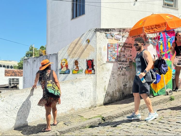将近彩色台阶时,就见街道和建筑明显边缘化了,两边满是壁画和涂鸦,小摊贩一溜排开