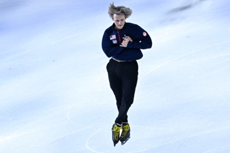 2026年2月21日,美国选手马里宁在2026年米兰-科尔蒂纳冬季奥运花式滑冰表演赛上表演。(Wikus De Wet/AFP)马里宁沉着冷静地应对了失利。他在看台上为队友加油助威,并在周六晚上的闭幕表演中奉献了一场充满情感的演出。