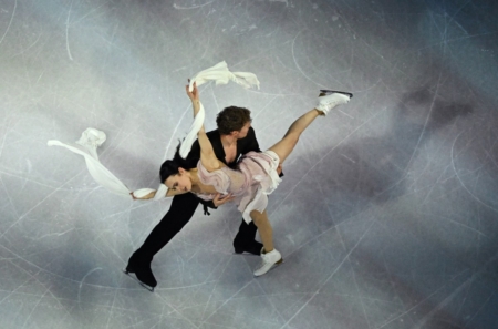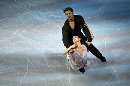 2026年2月21日,美国选手冰舞组合麦迪逊‧乔克(Madison Chock)和埃文‧贝茨(Evan Bate)在2026年米兰-科尔蒂纳冬季奥运花式滑冰表演赛上表演。(Antonin Thuillier/AFP)