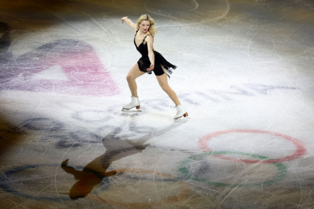 2026年2月21日,美国选手安珀‧格伦在2026年米兰-科尔蒂纳冬季奥运花式滑冰表演赛上表演。(Maja Hitij/Getty Images)