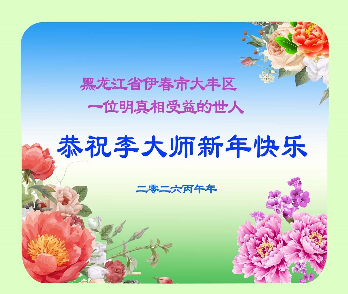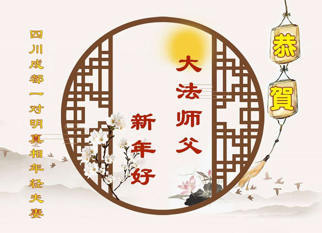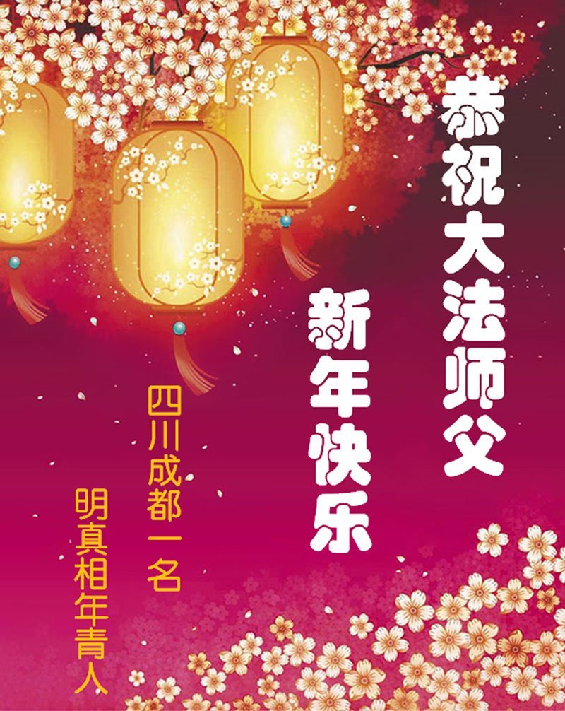“恭祝慈悲伟大的大法师父新年好!新年快乐!靶恩法轮大法师父!‘法轮大法好、真善忍好!’”