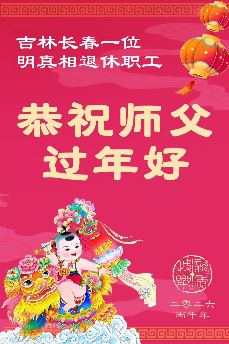 退休职工写道:“我是一位受到李大师帮助的患者,赞同大法,念诵‘法轮大法好、真善忍好!’,并且听了李大师的讲法,很是受益,特此感谢李大师的帮助!再次恭祝李大师过年好!祝李大师全家过年好!”