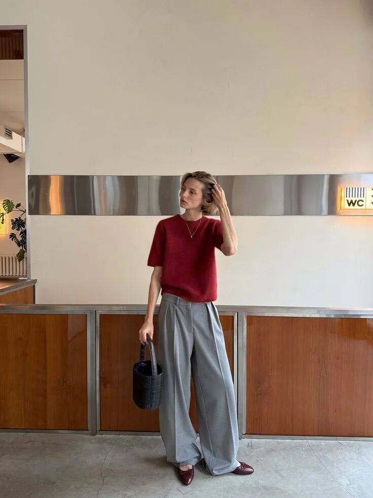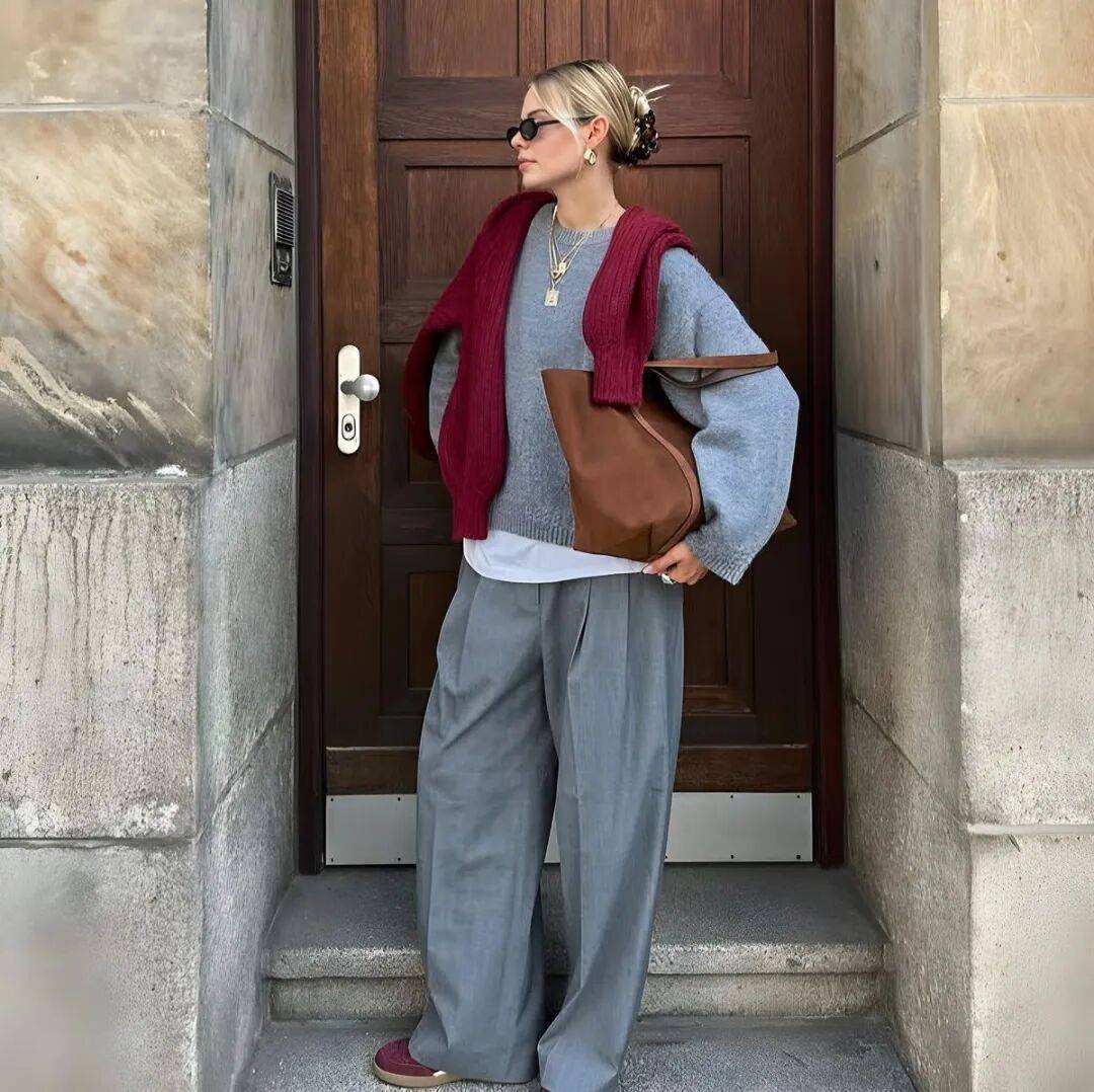 或者用深灰色阔腿裤配酒红针织,慵懒又不失贵气高级,也有藏在理性之下的柔情。