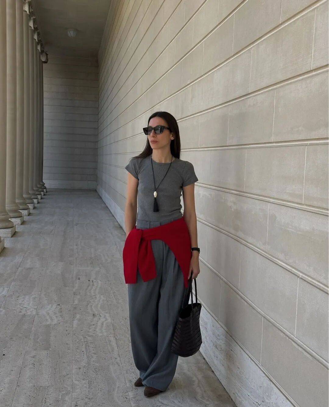 另一种思路是让红色形成呼应。灰色套装搭配红色手袋,若再加上一双红色浅口鞋,红色便在上下有了延续。