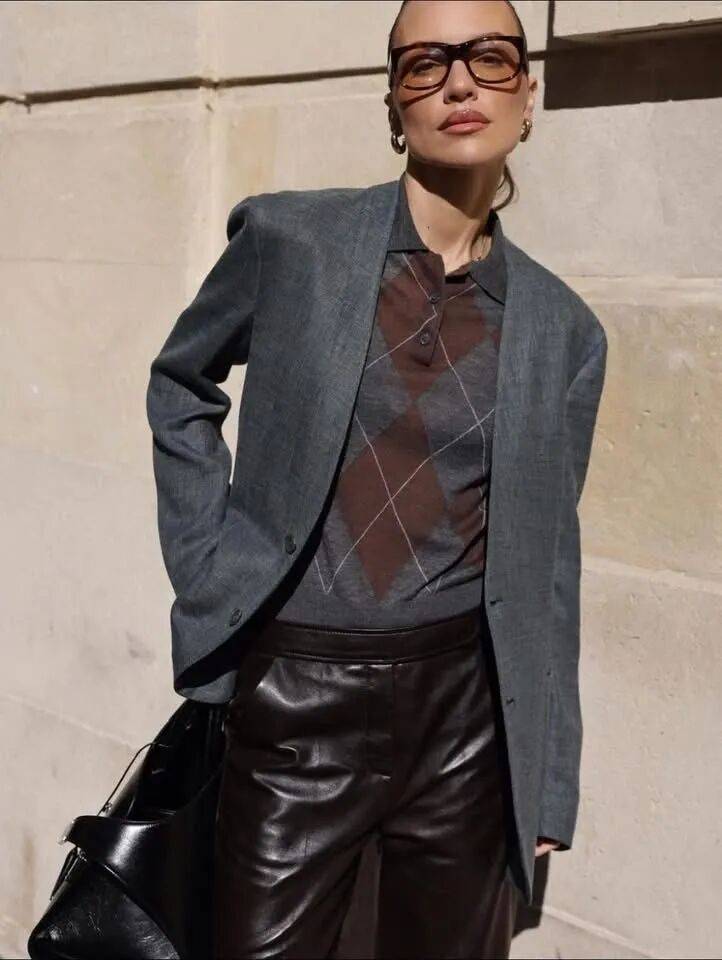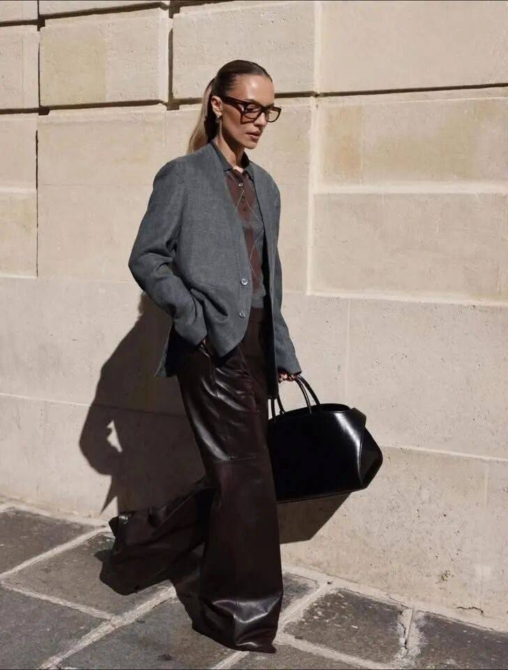 皮革的显深邃,毛衣的柔软,加上不同材质对光线的不同反应,让整套穿搭在一天的光影变化中呈现出丰富的层次。