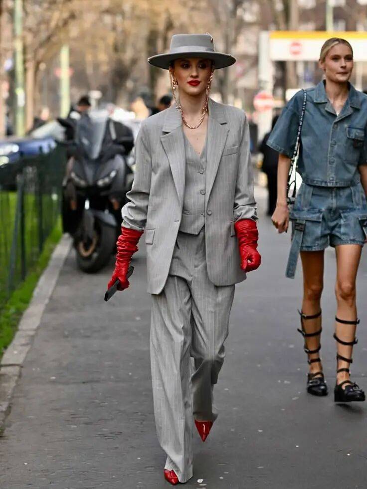 正红依然经典,但可以尝试那些在阳光下显得轻盈而通透面料,与浅灰搭配时,像初春枝头的第一抹花苞,鲜嫩而有生命力。