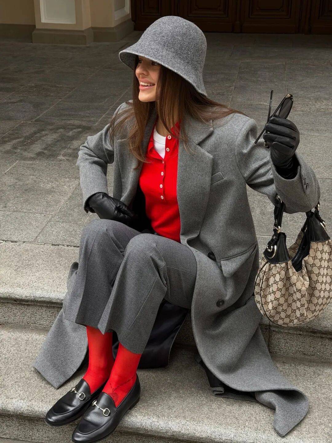 如果所在城市的春天来得早,阳光已经有了暖意,不妨用更明亮的灰色,搭配更耀眼的红色,与这个万物复苏的季节相得益彰。