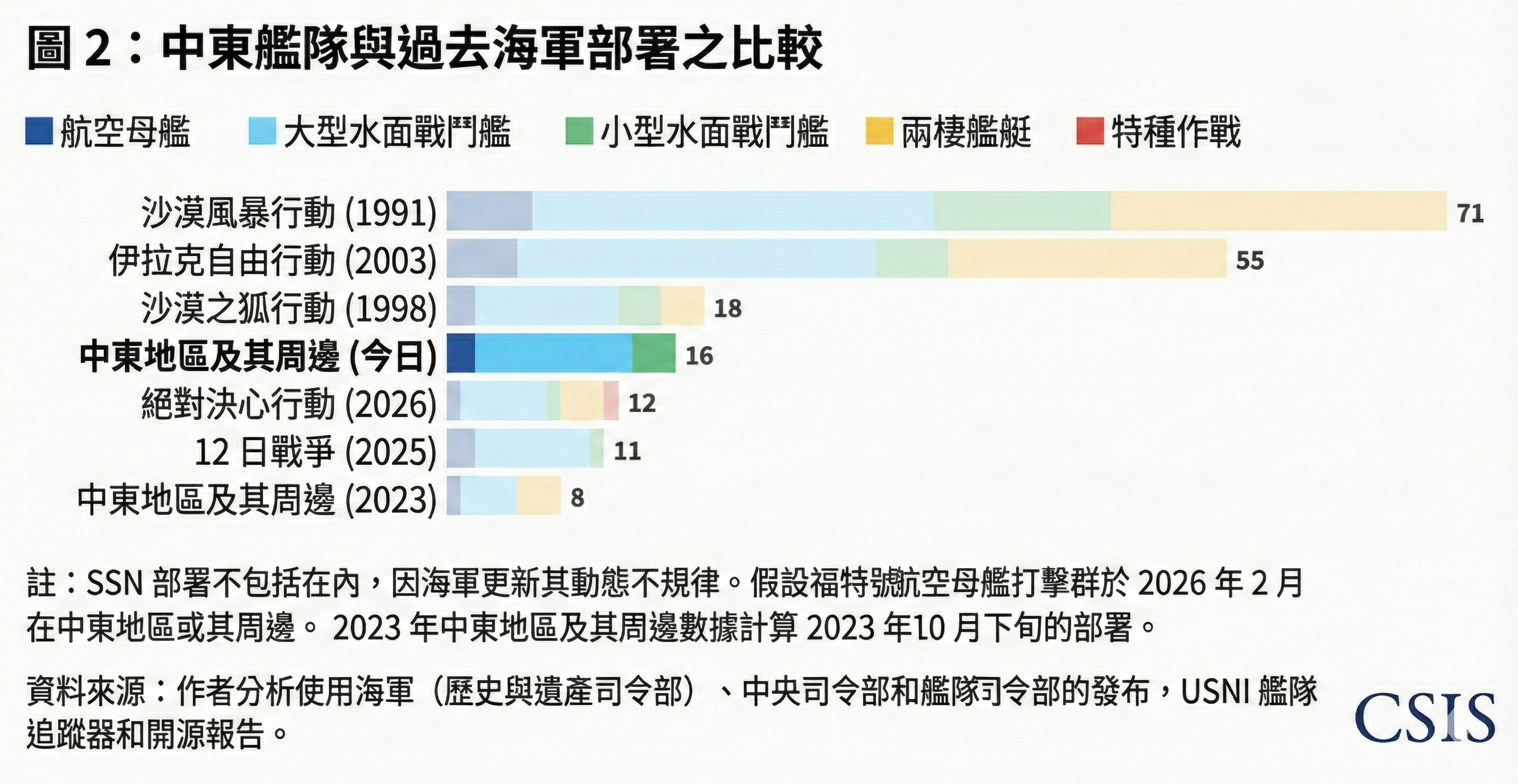 Studies,CSIS)的最新统计,美国海军和空军在中东地区已经部署了大约200架各式军机,当中包括两架用来协调空中军事行动的E-3空中预警机,以及超过20架空中加油机。航空母舰已有两艘到场,大型水面战舰有11艘,舰载战机也有超过90架。