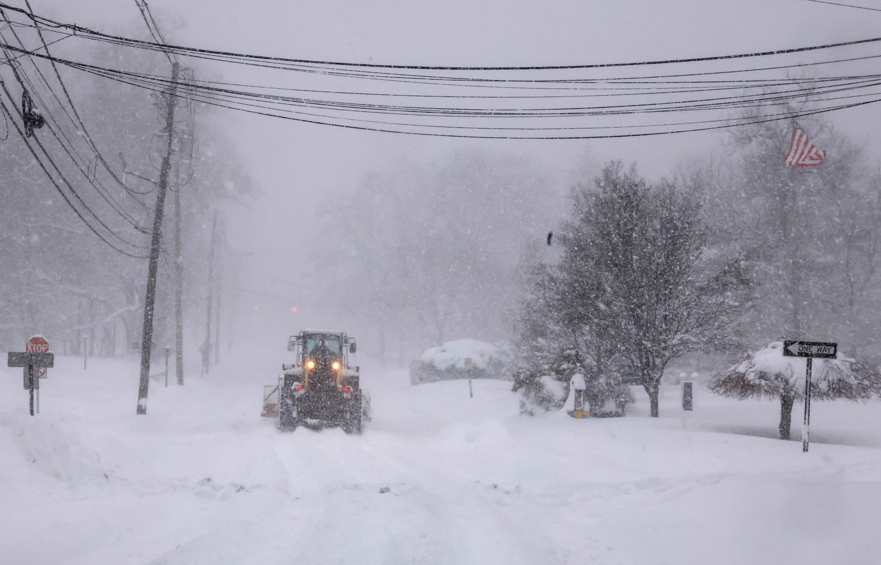 2026年2月23日,新泽西州诺伍德(Norwood)遭暴风雪袭击,一台挖掘机清理主街上的积雪。(Kena Betancur/Getty Images)