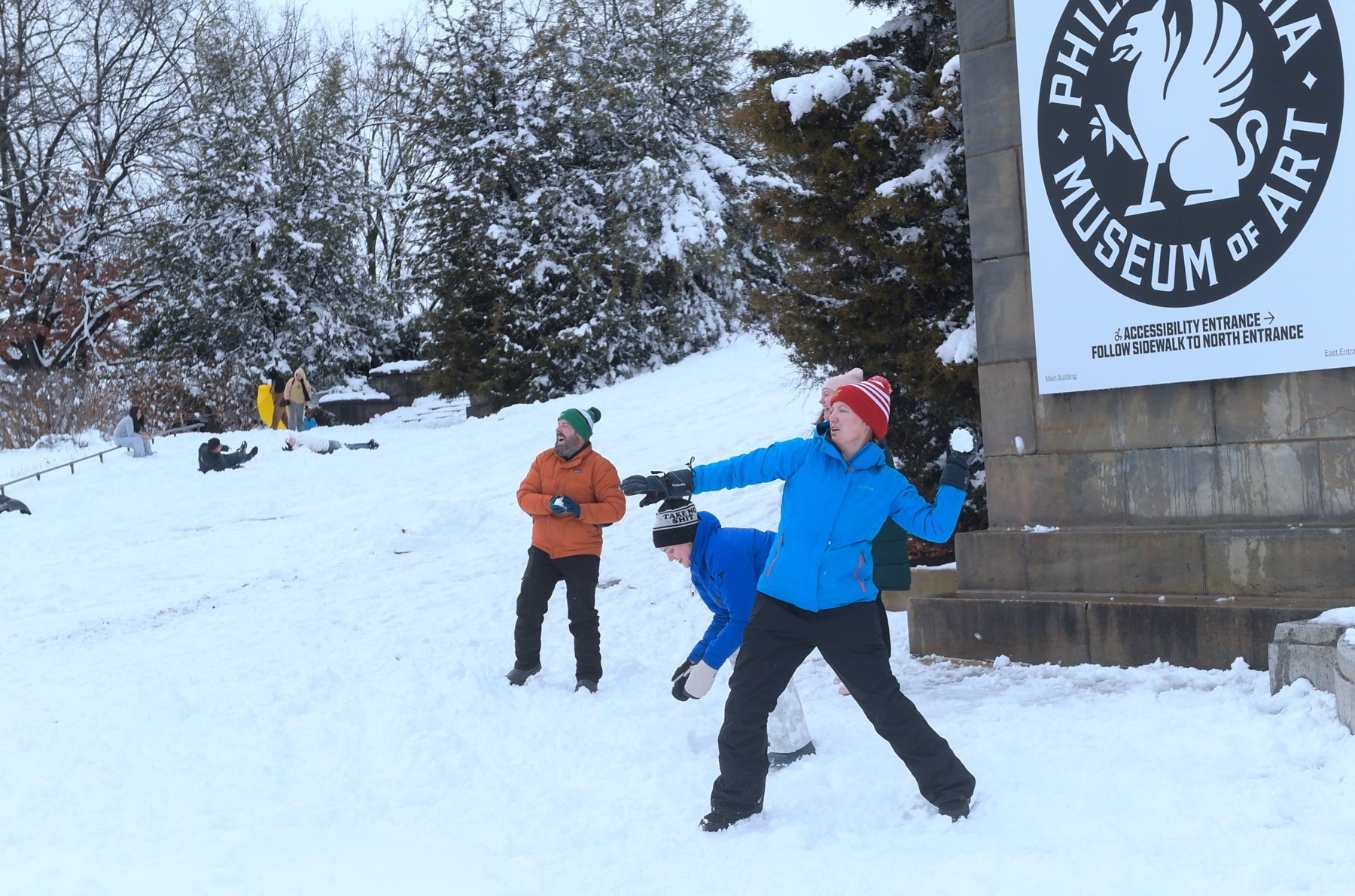 2026年2月23日,宾夕法尼亚州费城遭暴风雪袭击,当地居民在费城艺术博物馆前玩打雪仗。(Matthew Hatcher/Getty Images)马萨诸塞州