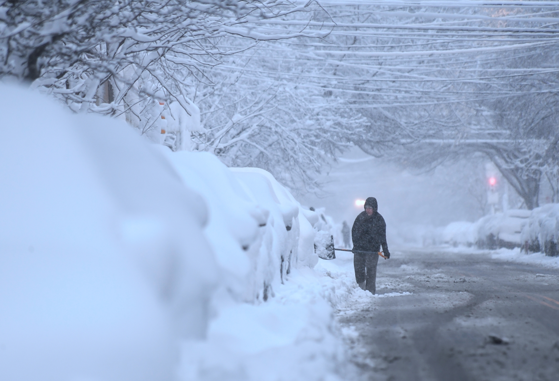 2026年2月23日,宾夕法尼亚州费城遭暴风雪袭击,居民在清理街道和汽车上的积雪。(Matthew Hatcher/Getty Images)