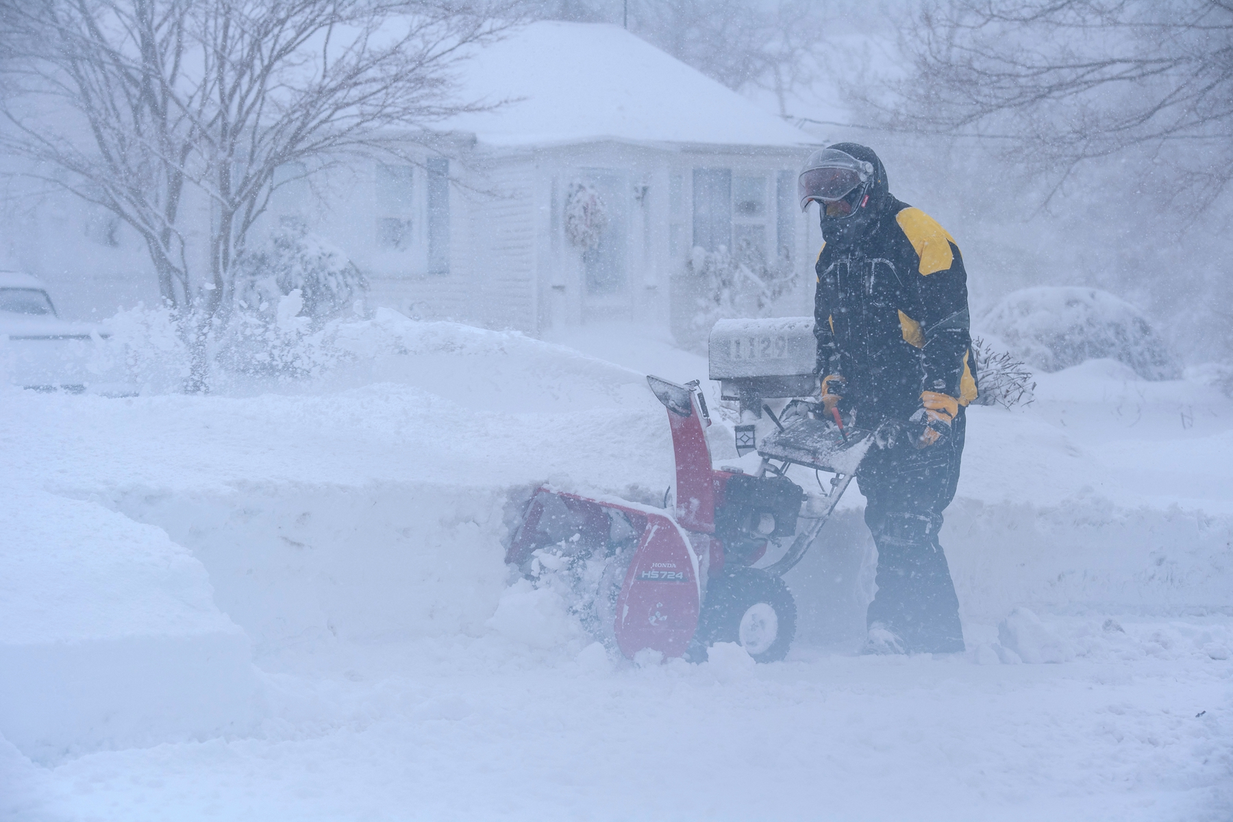 2026年2月23日,马萨诸塞州诺威尔(Norwell)遭暴风雪袭击,一名男子使用吹雪机清理房屋前的积雪。(Joseph Prezioso/AFP via Getty Images)