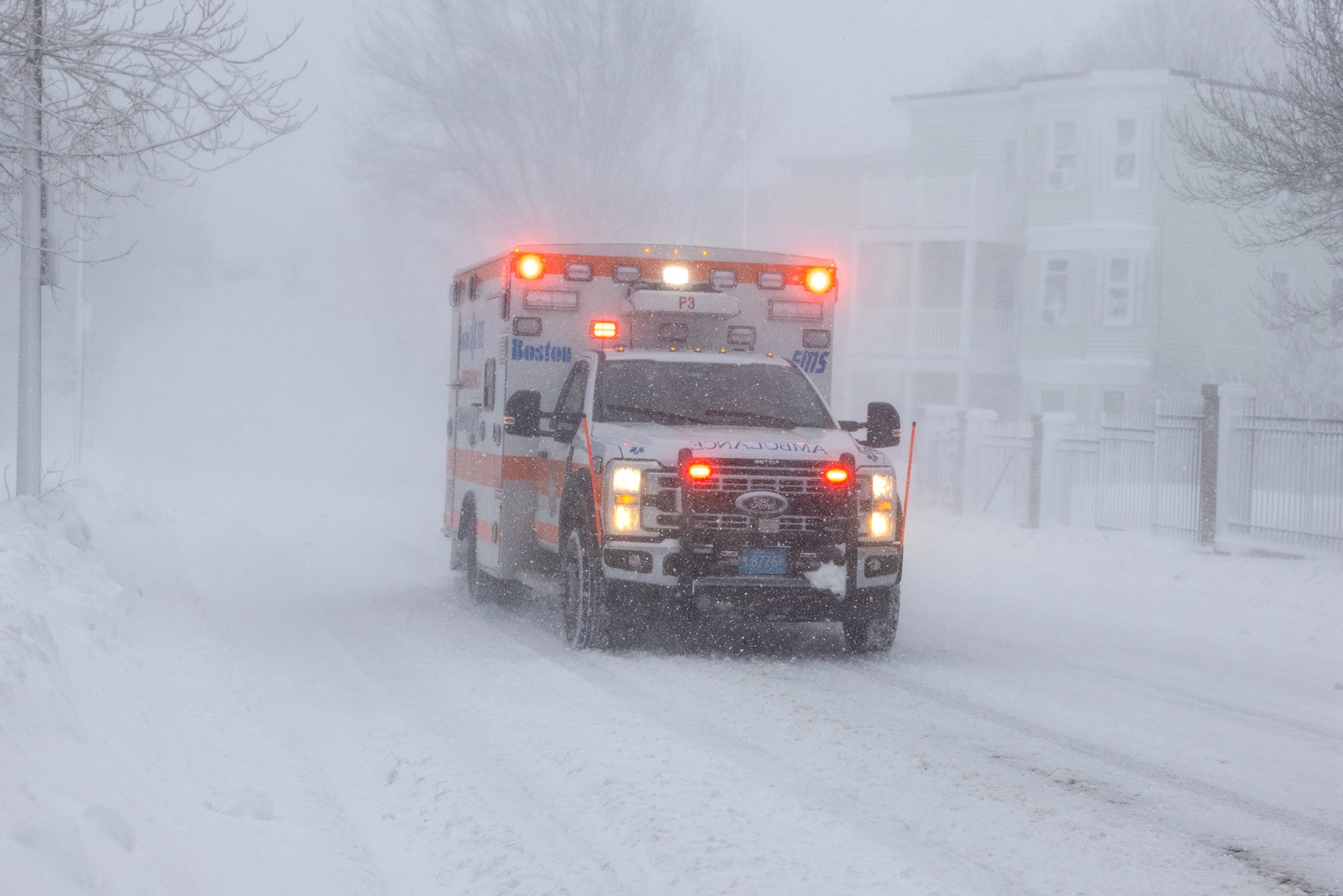 2026年2月23日,马萨诸塞州波士顿遭暴风雪袭击,一辆救护车在白茫茫的雪天街道上行驶。(Scott Eisen/Getty Images)