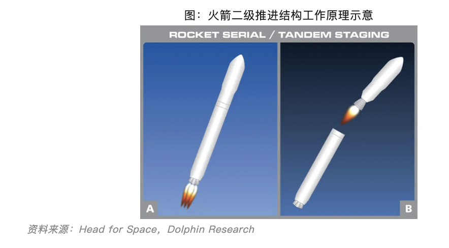 火箭在发射过程中,一级推进器先点火,待火箭被推进至远离稠密大气层的高空中之后,一二级分离,二级发动机点火接替工作(此时整流罩也已脱落),最终将有效载荷(比如卫星)推进至预定轨道。