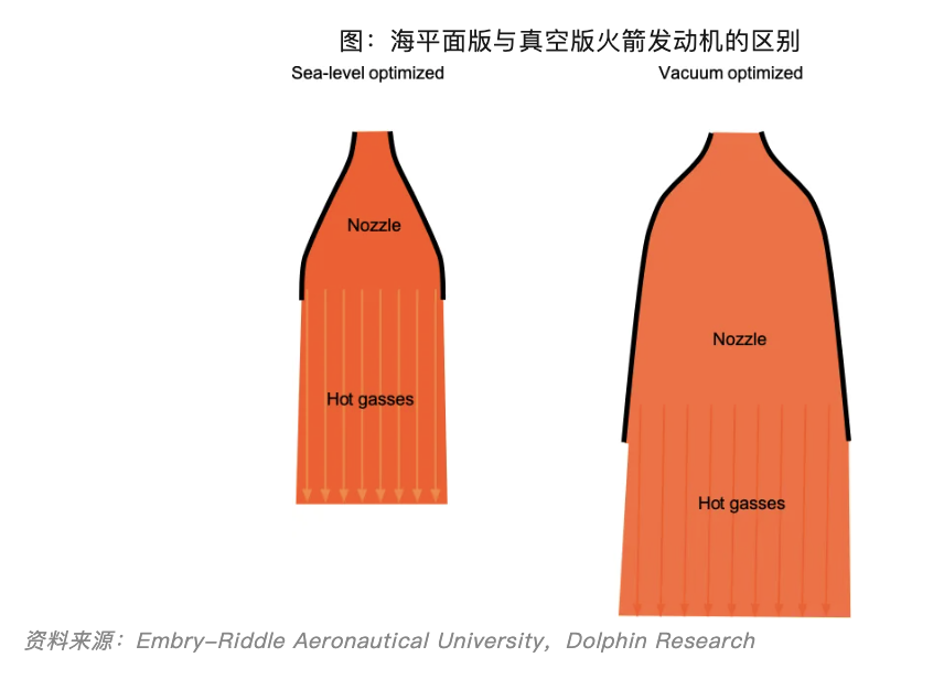 为什么要采用这种分级架构呢?主要有两点:一是通过逐级减少重量来最大化效率,比如一级推进器抛掉后可大幅降低火箭重量;二是可以使得发动机进行专门化设计,因为发动机在稠密大气层vs真空环境中所适合的结构是不同的,简单来说,一级发动机的喷管要设计得相对短粗,而二级的真空发动机喷管则呈现出长大的钟形。