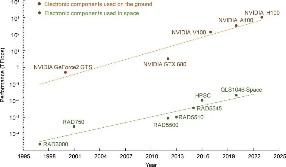 图:现有抗辐射处理器与成熟的地面COTS的性能表现对比