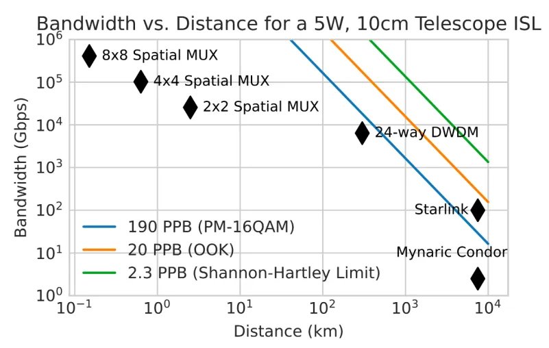 图:Google论文中关于提升卫星间传输带宽方案的带宽与距离的关系