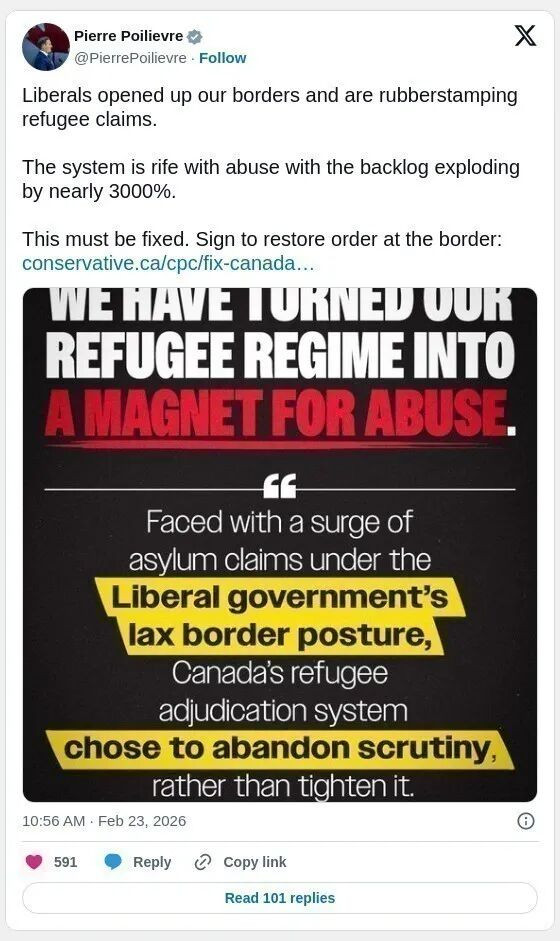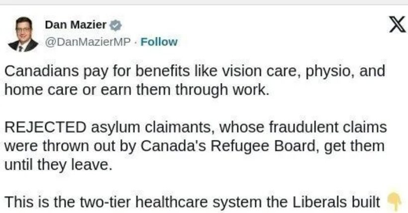 他在另一篇帖子中批评即使是被加拿大难民委员会驳回的庇护申请者(其申请系欺诈性质),仍能获得视力保健、理疗和家庭护理等福利,直到他们离开为止。