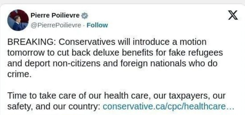 保守党领袖博励治(Pierre Poilievre)已经在社交媒体上对动议的部分内容进行了预告。博励治称,保守党将于明日提出一项动议,削减假难民的豪华福利,并将犯罪的非公民和外国国民驱逐出境。