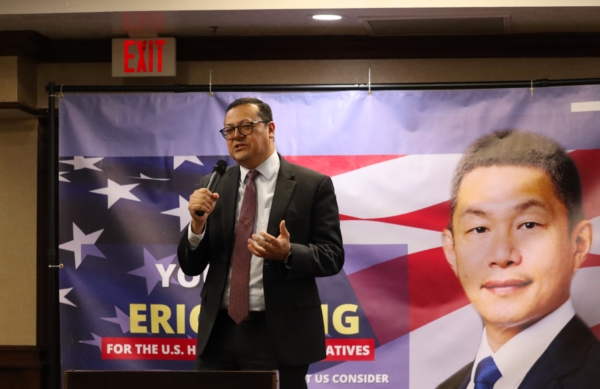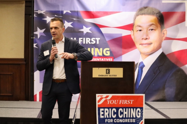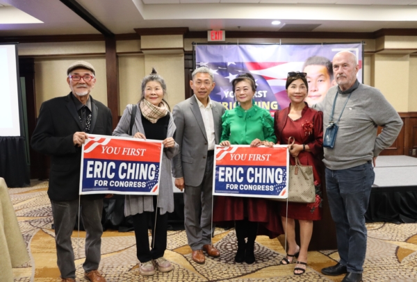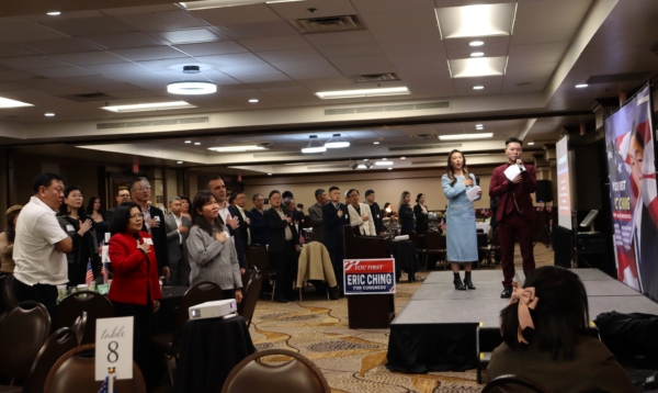 在核桃市议会任职12年的秦振国(Eric Ching),目前正在竞选加州第31区国会众议员。近日,橙县圣安娜市(Santa Ana)西班牙裔和华裔支持者们为其举办了一场竞选筹款会,现场气氛热烈,人们纷纷上台发言。