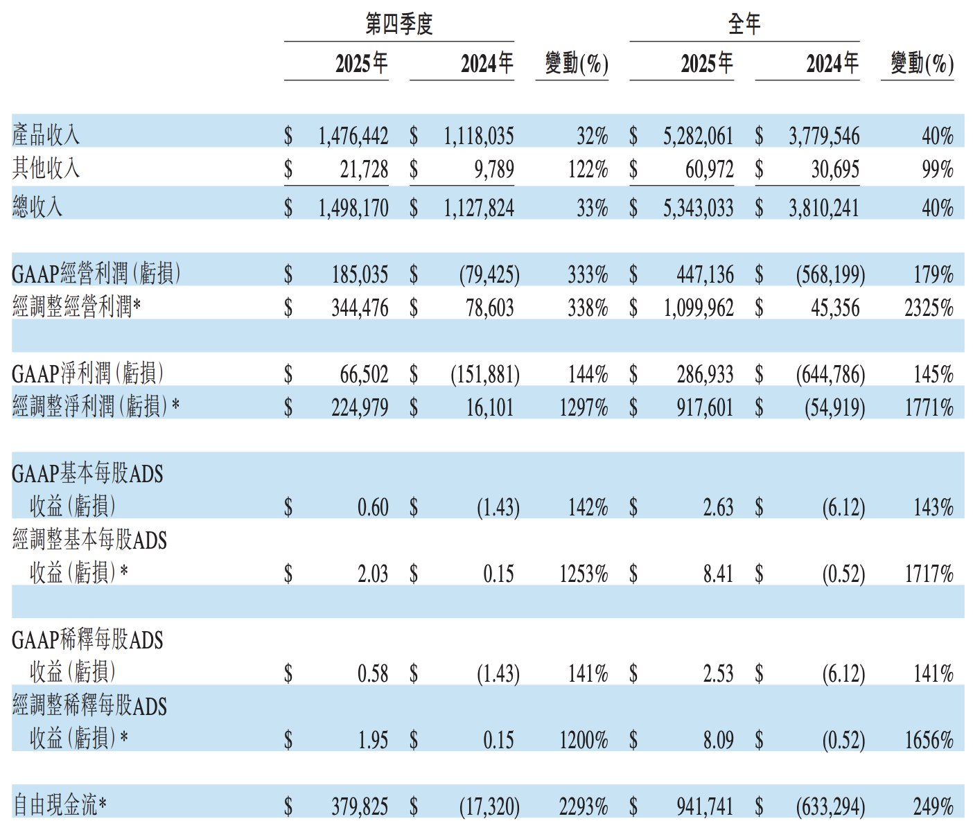 2025年全年GAAP净利润2.87亿美元,一举扭转2024年净亏损6.45亿美元的局面,实现历史性盈利。