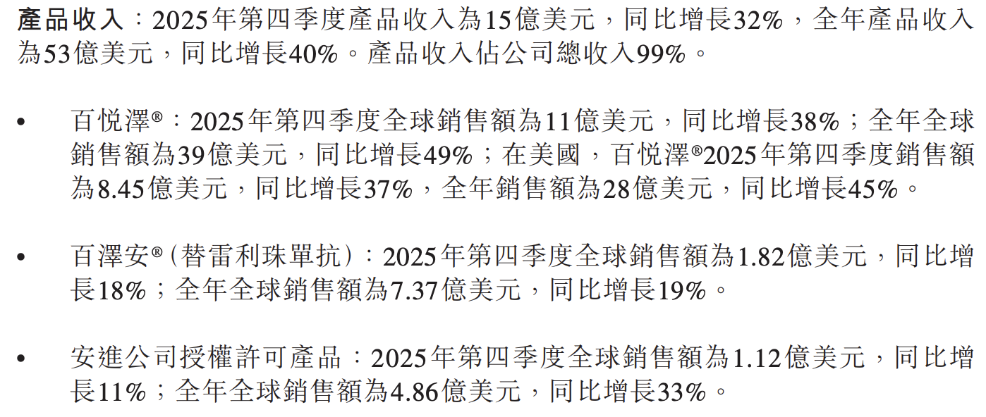 旗舰产品百悦泽(泽布替尼)继续高速扩张,全年全球销售额39亿美元,同比增长49%;第四季度单季销售突破11亿美元,同比增长38%。美国市场全年贡献28亿美元,同比增长45%,稳坐全球BTK抑制剂市场第一位置。