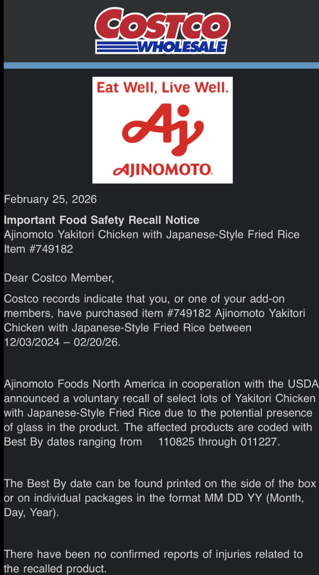 周三(2月25日),Costco向会员发送了一封电子邮件,宣布味之素北美食品公司(Ajinomoto Foods North America)正在与美国农业部(USDA)合作,自愿召回特定批次的 “日式烤鸡炒饭(Yakitori Chicken with Japanese-Style Fried Rice)”。