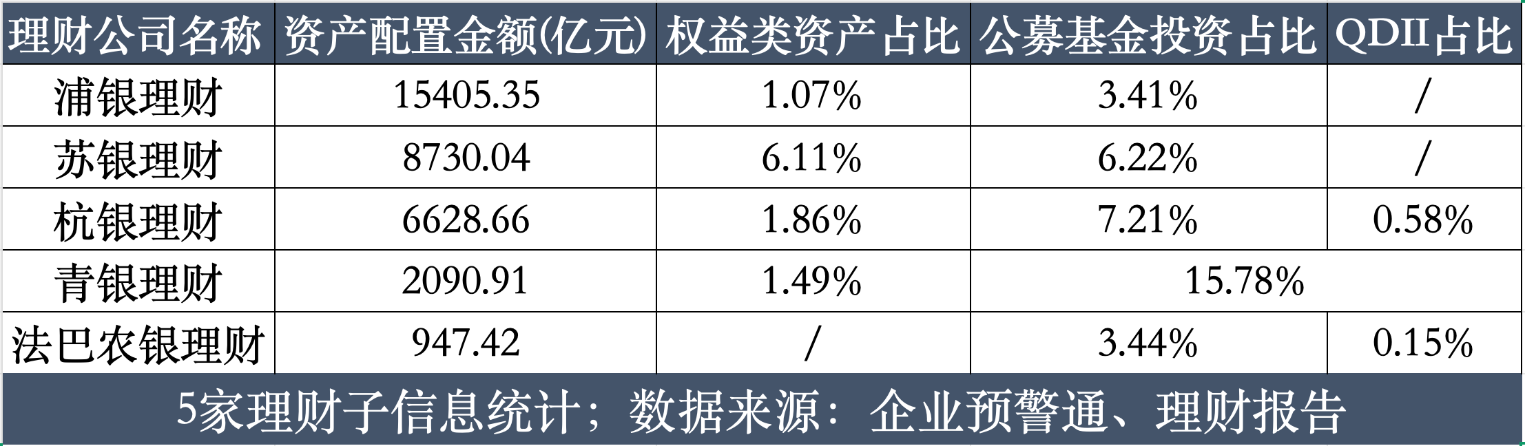 信风注意到,上述理财子中,法巴农银理财固收类产品占比达100%,青银理财固收占比达99.98%,浦银理财占比达99.91%,杭银理财也维持在99.22%的高位;资产端,浦银理财、苏银理财、青银理财的权益类资产占比,均出现小幅下滑。