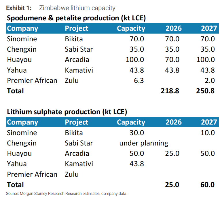 据追风交易台消息,摩根士丹利在最新的快评中把问题说得很具体:华友的Arcadia项目50kt LCE硫酸锂产能预计在2026年一季度末开始投产;中矿资源Bikita的30kt产能计划在2027年中投产;盛新锂能和雅化集团的下游加工产能仍在规划阶段。换句话说,津巴布韦当前能以硫酸锂形式合规出口的产能,2026年仅有25kt LCE,2027年才能增至60kt LCE。