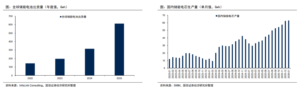 InfoLink数据显示,2025年全球储能电池出货量达612.39GWh,同比增长94.6%,四季度单季首次突破200GWh。进入2026年,这一势头没有减弱:1月国内储能电芯产量63.02GWh,环比仅增0.8%;2月受春节影响,SMM预计产量环比减少8.8%——但考虑到2月天数少且有长假,这一降幅说明开工率实际上维持在高位。