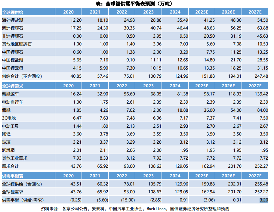 值得注意的是,国信证券的供需表显示,2027年全球锂供给预计快速增至247.5万吨LCE,届时将产生约3.2万吨的净过剩——换句话说,20万以上的价格可能是窗口期,而非新的平衡点。
