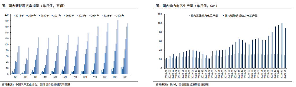 动力电池需求年初遇冷——购置税从全额免征改为减半征收,叠加淡季效应,1月国内新能源汽车产销环比分别下降39.4%和44.7%。但中汽协预测,2026年全年国内新能源汽车产销有望达1900万辆,同比增长15.2%,欧洲市场预计增长28.4%。国信证券判断,从3月开始动力电池需求有望迅速回暖,全年增速仍有望维持20%左右。