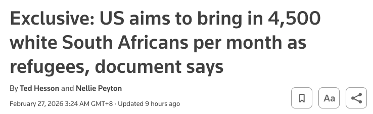 川普曾表示,美国将在2026财年仅接收全球7,500名难民。相比之下,去年内部曾讨论的接收上限为40,000至60,000人。截至1月31日,自2025年5月启动的相关项目下,仅有2,000名南非白人以难民身份进入美国,不过近几个月接收速度有所提升。