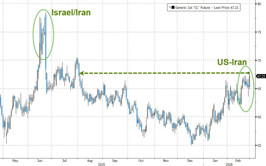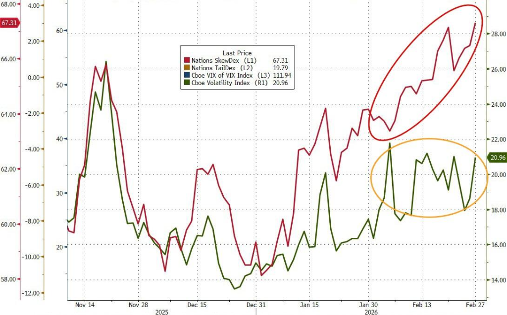 尽管VIX指数在2月份仅仅回到21点,但因为套期保值者纷纷涌入市场寻求下行保护,其偏斜度飙升至2025年10月以来的最高水平。