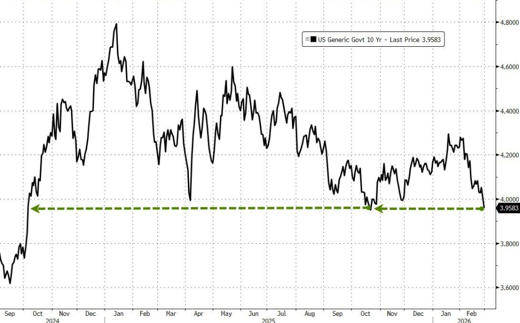 市场避险情绪继续升温的背景下,10年期国债收益率下跌5.7个基点,跌破了4.00%的关键心理关口,为去年10月以来首次。彭博行业研究分析师Herman
