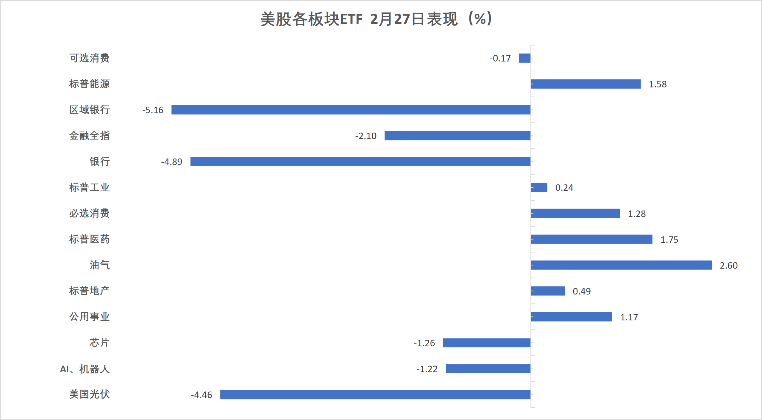银行板块重挫,标普区域银行ETF跌超5%,KBW银行ETF跌4.89%。太阳能ETF重挫4.46%。油气板块涨2.60%。
