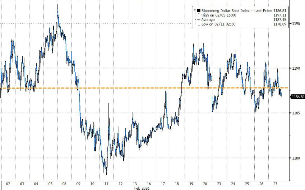 彭博美元指数跌0.09%,报1186.93点,2月份累跌0.11%,交投区间为1197.11-1178.09点。