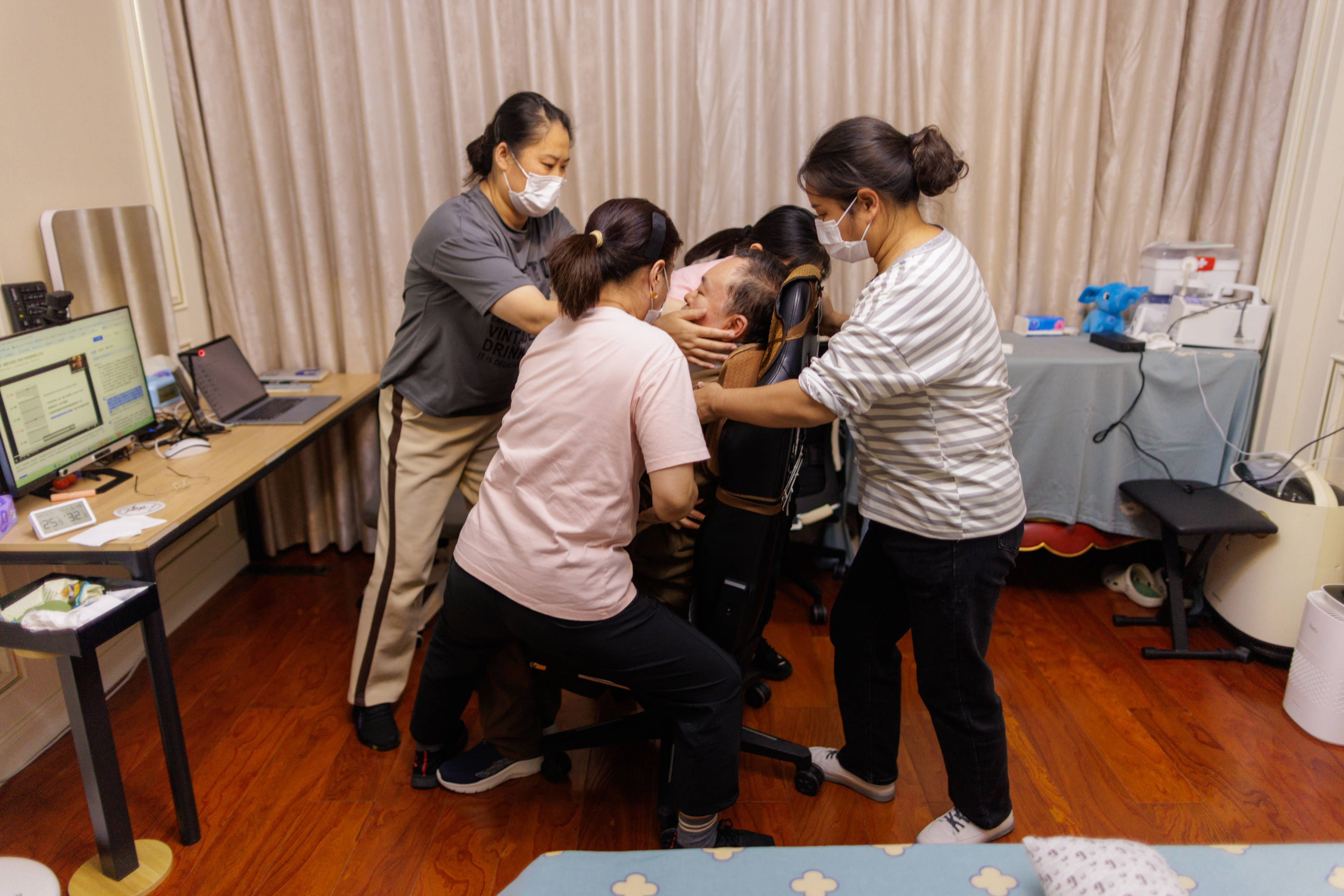 2025年12月31日,蔡磊起身需要4个人帮助。新京报记者 王子诚 摄